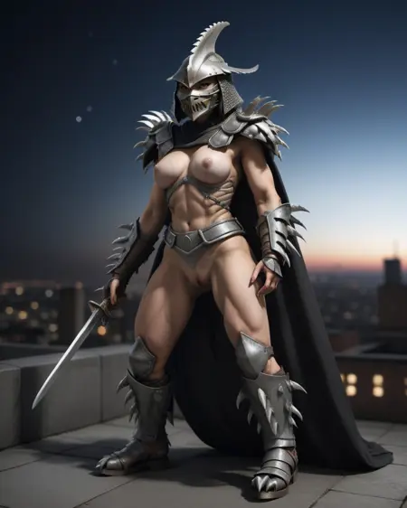 "a muscular TMNTSuperShredder 1man armored samurai knight, wearing a dark purple outfit with serrated claw spike pauldrons and serrated claw gauntlets and serrated claw armored boots and serrated metal samurai helmet with mask, long black cape"