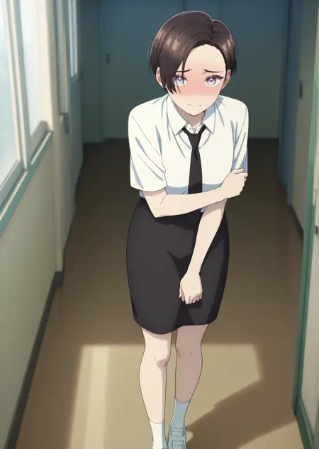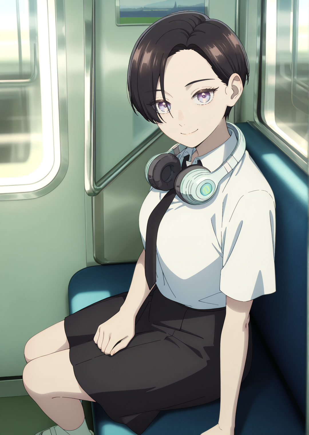 headphones, backpack, sweater vest, pencil skirt, white footwear, socks, sneakers, white shirt, school uniform, black skirt, collared shirt