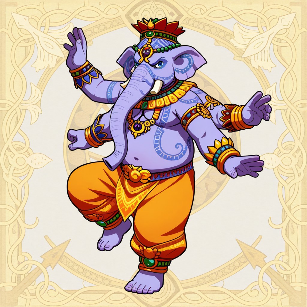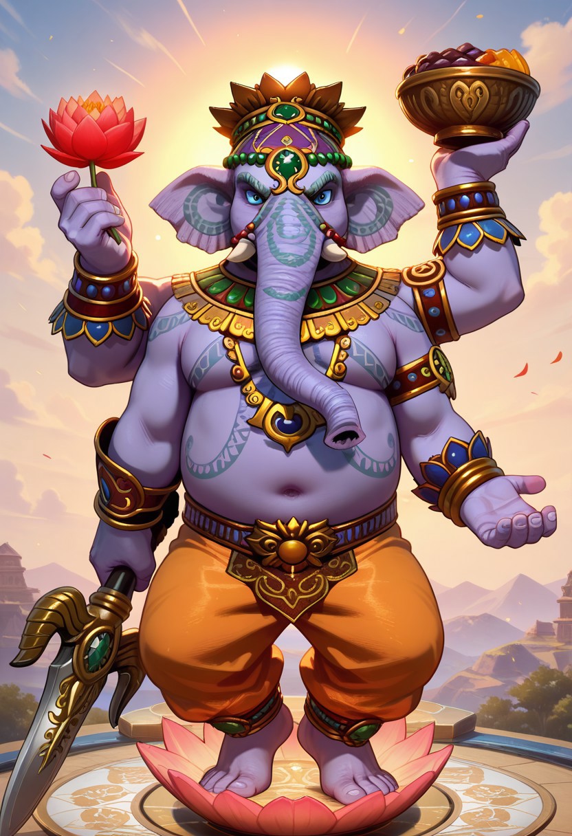 | 학습된 단어 | Ganesha, elephant, four arms, purple skin,anthropomorphic elephant, blue eyes, large wide ears, short ivory tusks, broken tusk, trunk, long elephant trunk, tattoo patterns on body, barefoot, five toes, tattoo patterns on face, five fingers복사됨! mukuta crown with green gemstones, beads, ornate gold jewelry, thick ceremonial necklace with blue and green gems, armlets, thick golden bracelets, golden ceremonial belt, orange-gold dhoti with green patterns, golden hindu payals with green beads, full body, expressive pose복사됨! phurba dagger, bowl, red lotus flower,복사됨! |