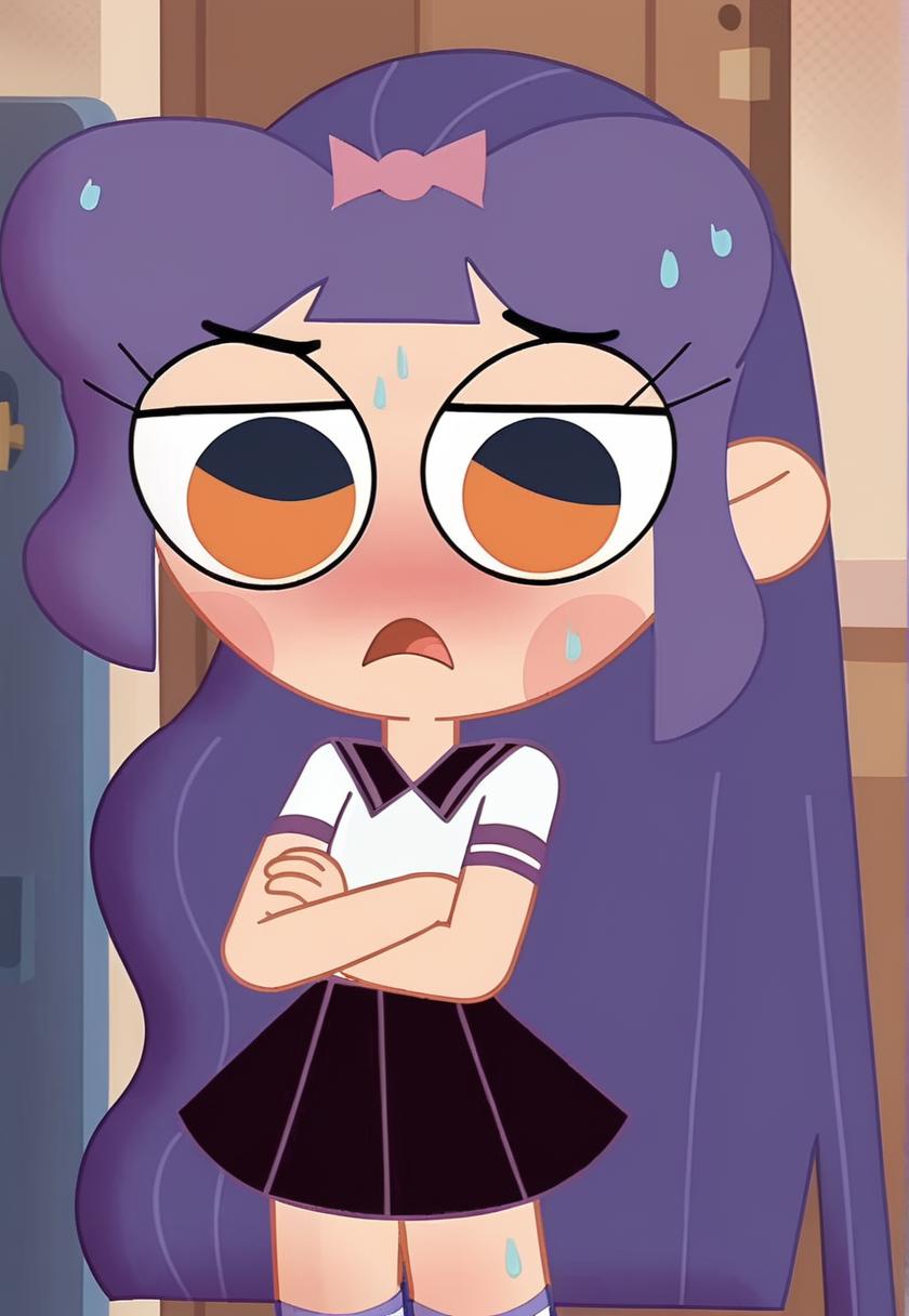 1girl, solo, chibi, very long hair, purple hair, long hair, blunt bangs, hair bow, pink bow, bow, orange eyes, blush stickers, blush, school uniform, serafuku, sailor collar, black sailor collar, white shirt, short sleeves, collared shirt, black skirt, pleated skirt, skirt, closed mouth, frown, v-shaped eyebrows, upper body, standing, looking at viewer