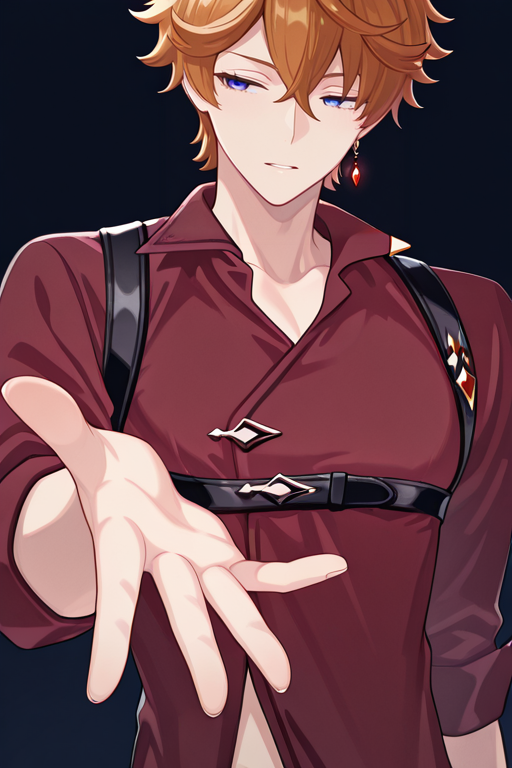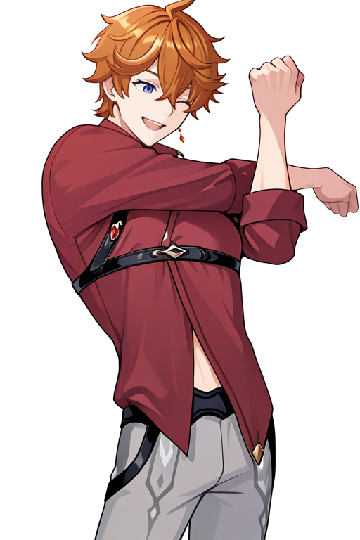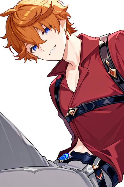 1boy, solo, hdtartaglia, 短髪, オレンジ色の髪, 青い目, 片耳のイヤリング