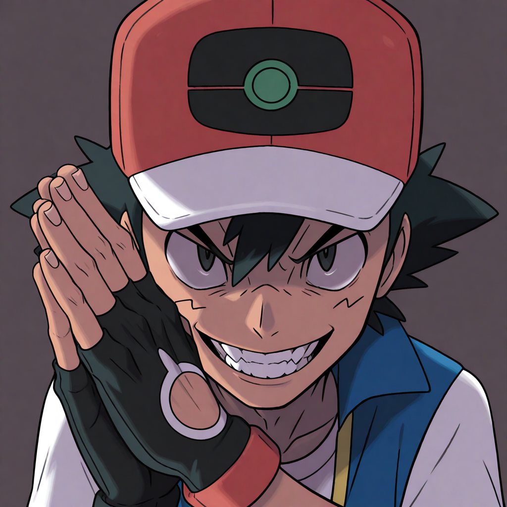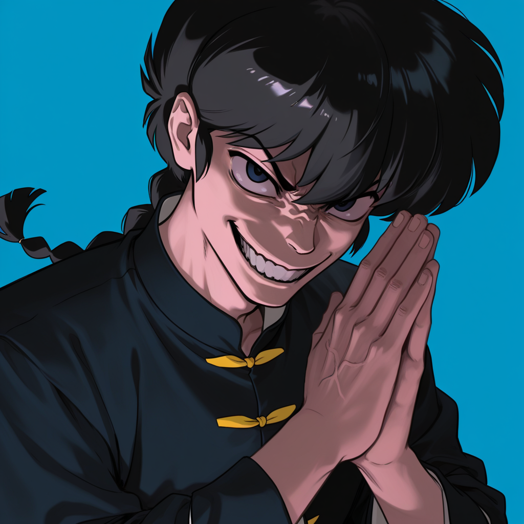 - 邪悪な笑み、両手を合わせる、歯、祈る