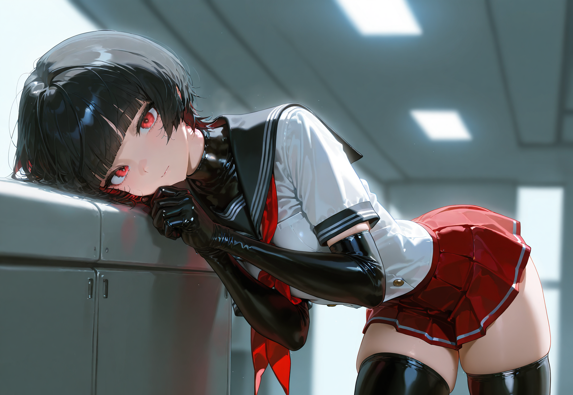 메구미: 아라르자, 1girl, 검은 머리, 빨간 눈, 곧은 앞머리, 단발, 흰 유니폼, 검은 장갑, 검은 라텍스 허벅지 긴 양말, 빨간 치마, 미니 치마, 검은 해군 칼라