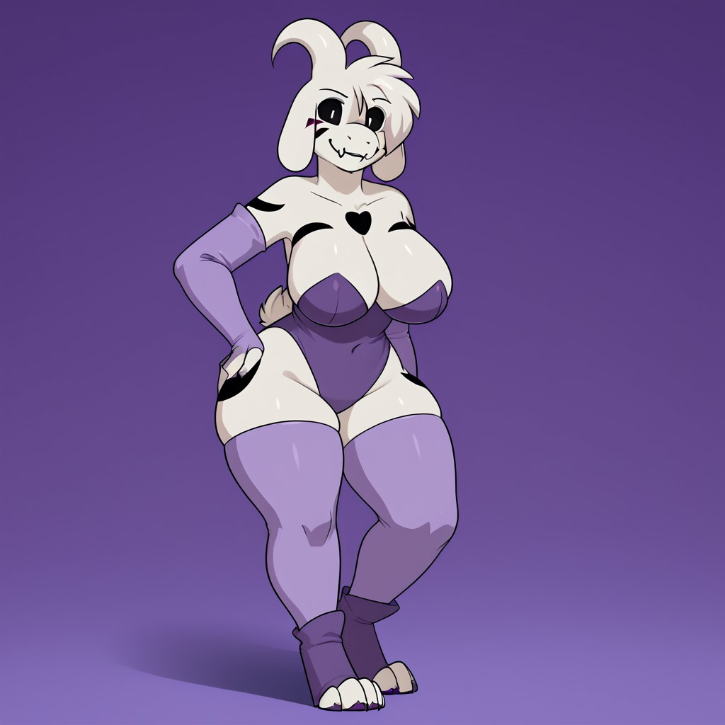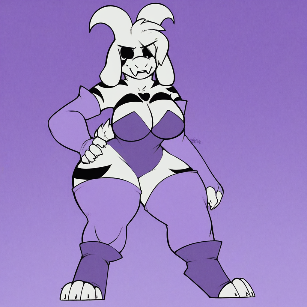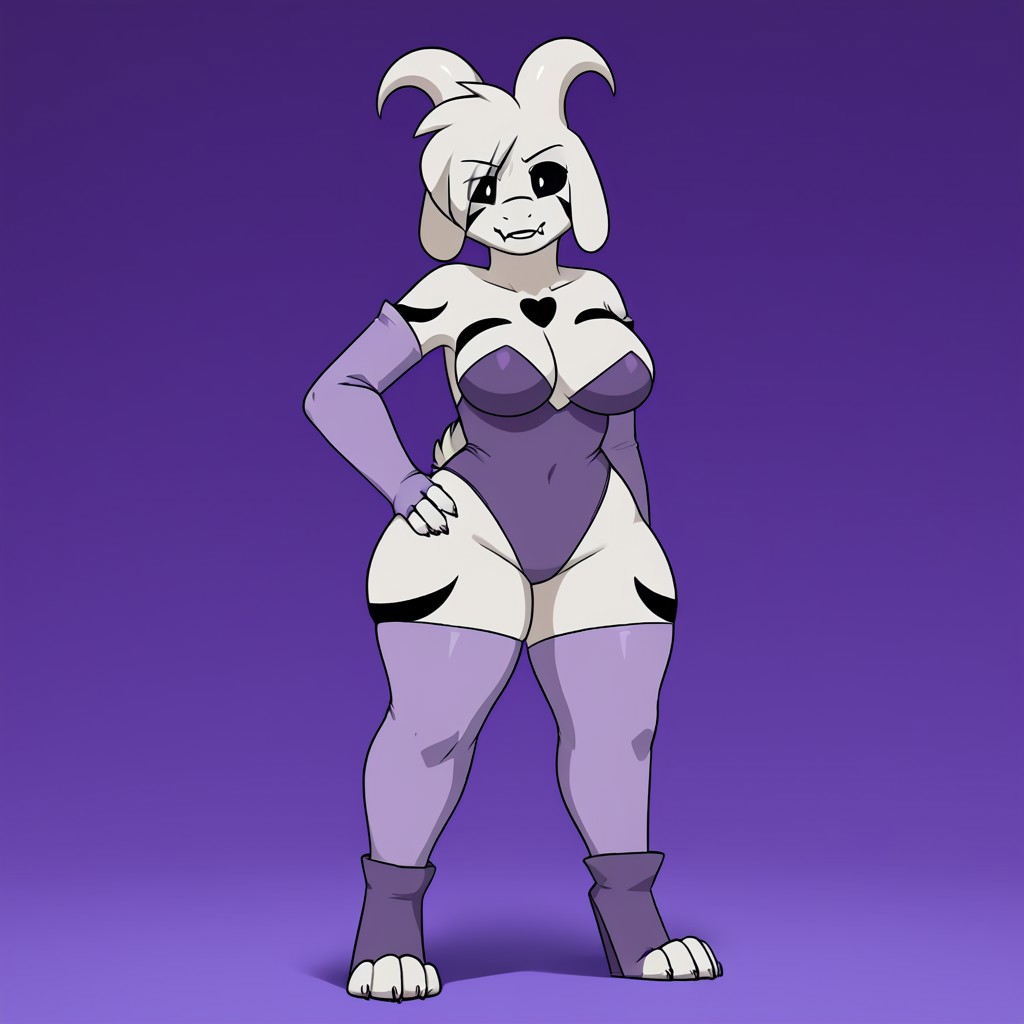 goat, goat girl, monster girl, white fur, black stripes, white pupils, black sclera, goat horns, goat ears, fangs, large breasts, curvey, thick thighs, wide hips, purple strapless leotard, purple elbow gloves, fingerless gloves, purple thighhighs, purple toeless footwear,