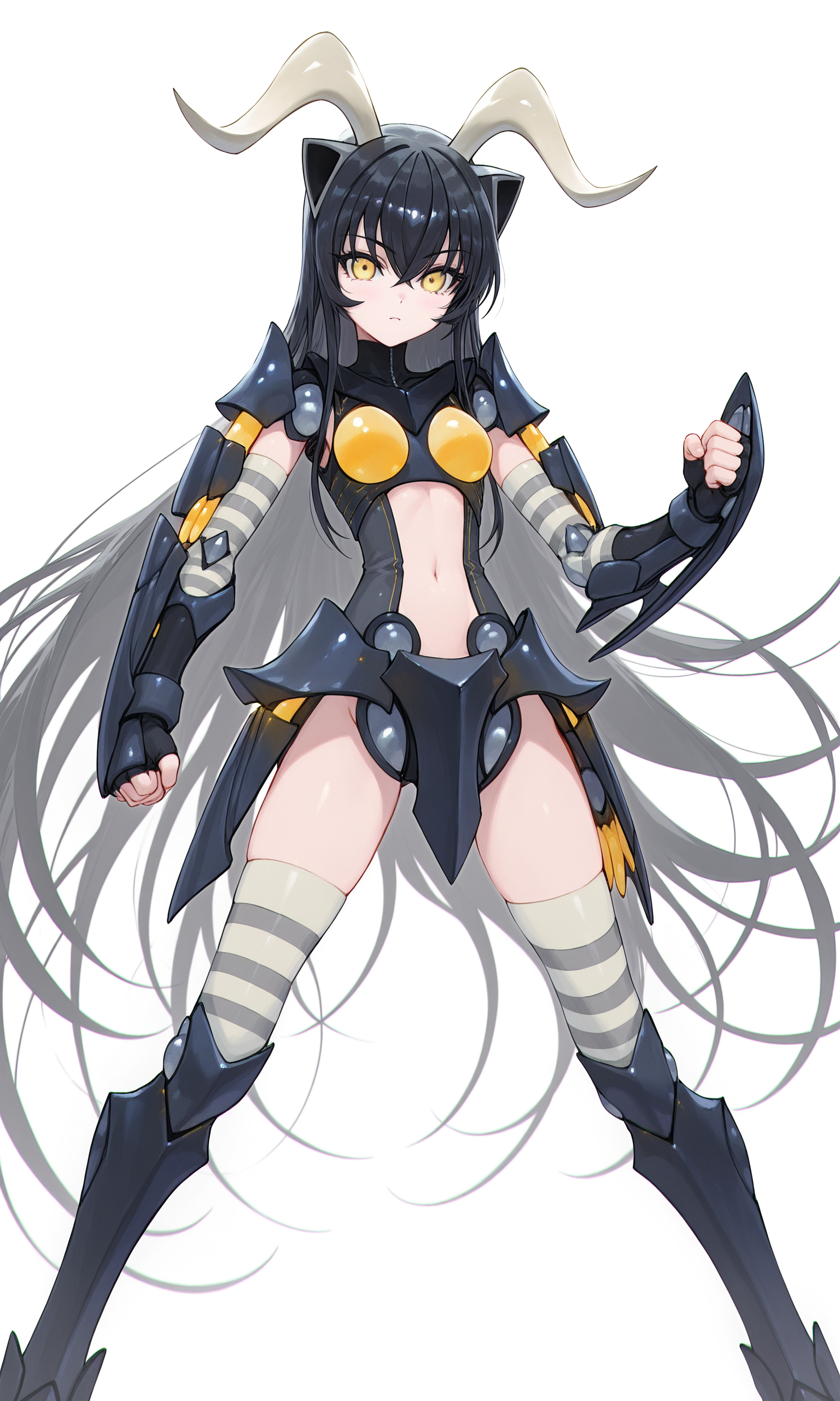 1 girl, zetto, yellow eyes, black hair, extra long hair, yellow tiara,horn trim,armor,