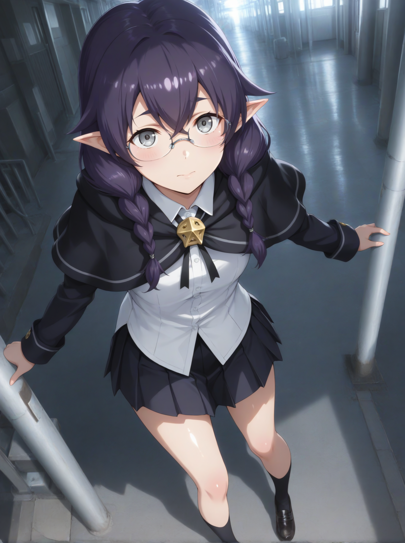 衣装:(学校制服、黒いカペレット、ロングスリーブカペレット、黒い袖、白いシャツ、外したシャツ、黒いプリーツスカート、黒い靴下、黒いドレスシューズ)