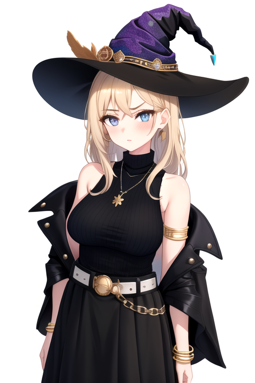 LilitWitch, 1girl, solo, long hair, breasts, blue eyes, black skirt, blonde hair, black dress, jewelry, bare shoulders, earrings, sleeveless, belt, ribbed sweater, bracelet, grey eyes, black headwear, turtleneck, witch hat, witch, black sweater
