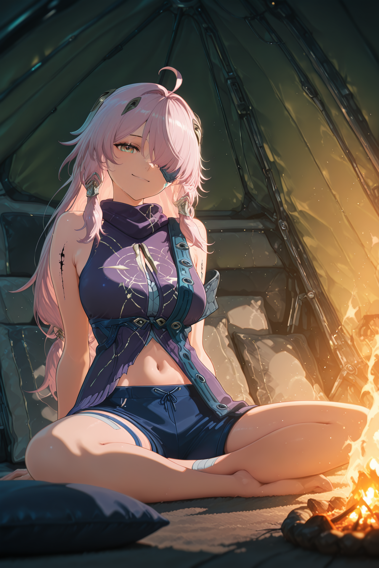 보라색 스카프, 보라색 투닉, 소매 없는 투닉, 비대칭 옷, 흰색 재킷, 열린 재킷, 흰색 벨트, 높은 벨트, 풍성한 긴 소매, 신부 장갑, 배꼽, 파란색 반바지, 허벅지 스트랩, 붕대 감은 다리, 다리에 붙박이 반창고, 검은 양말, 하이힐 부츠, 흰색 신발