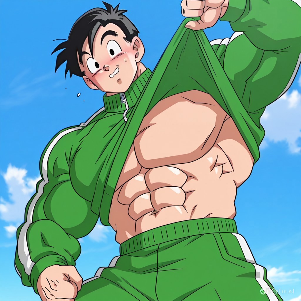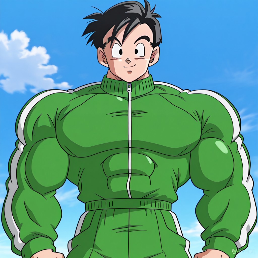 GohanBuff, 1boy, short black hair, spiked hair, black eyes, no pupils, green tracksuit, long tracksuit sleeves, long sleeves, two- tone green sneakers, very muscular,(big muscles: 1.5),wide body, wide back, clothed muscles, solo,