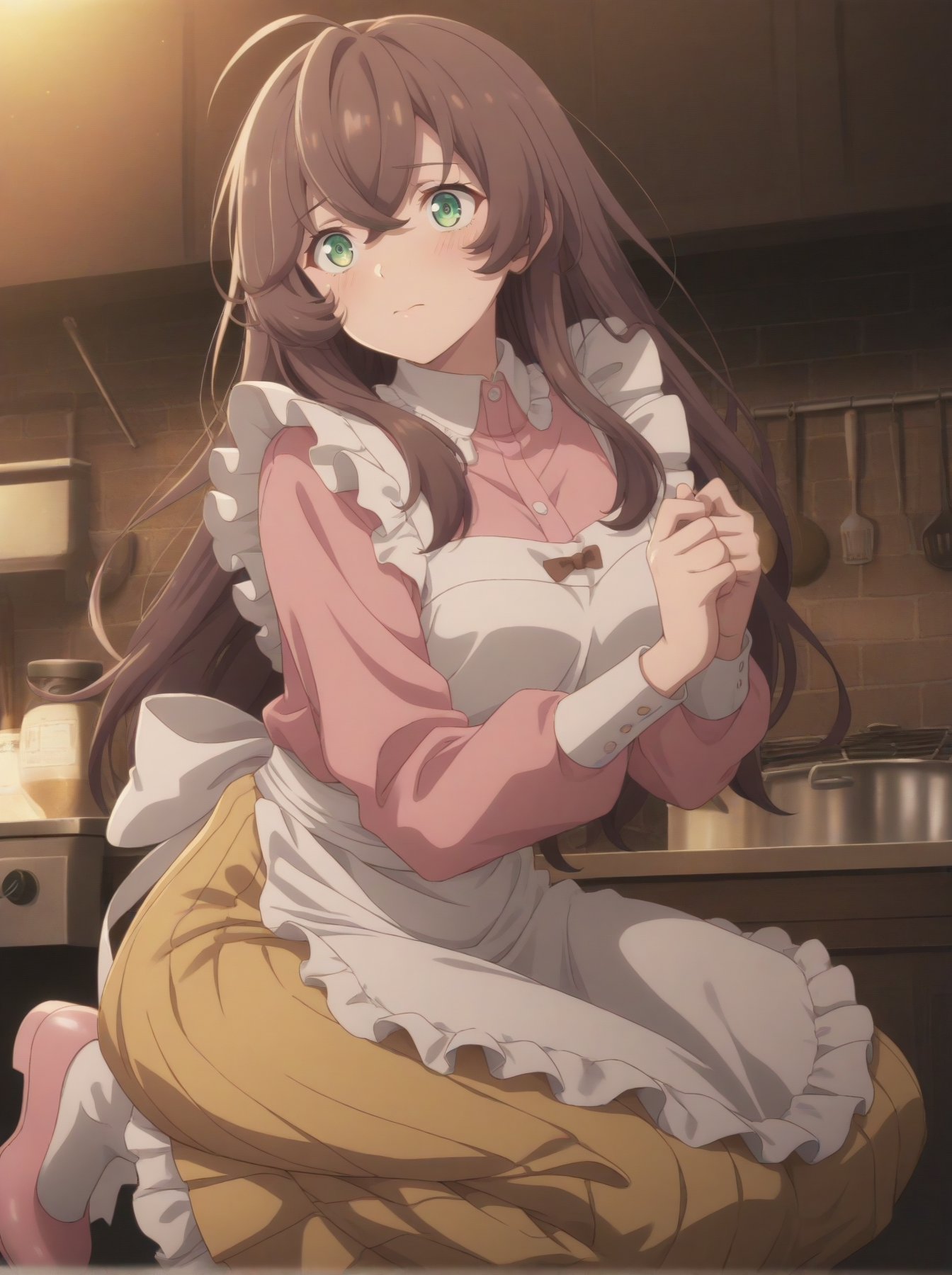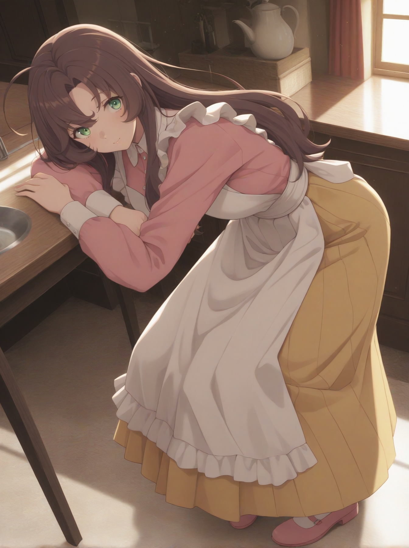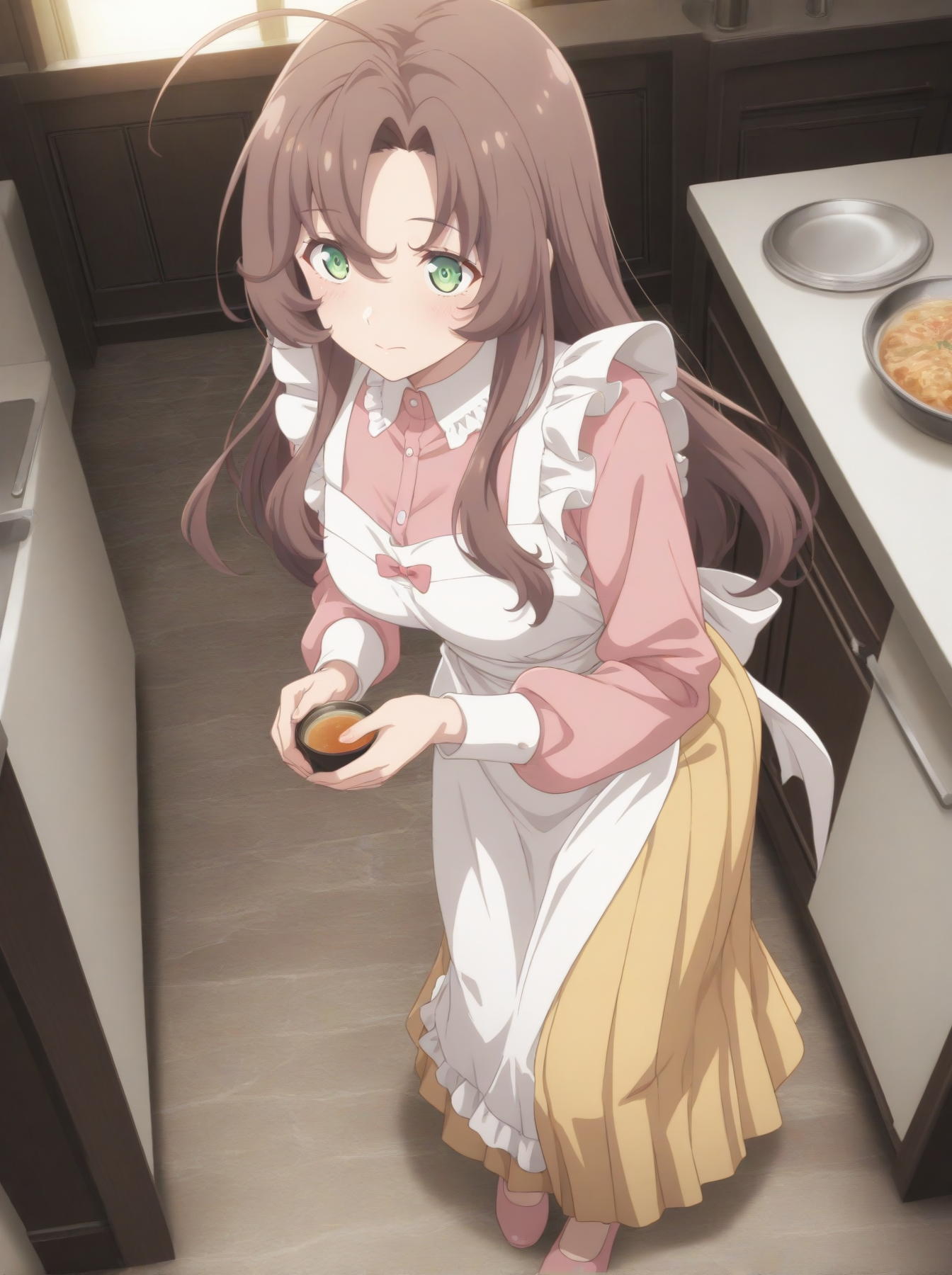 Clothes: (pink shirt, long sleeves, white collar, white apron, yellow skirt, long skirt, pink shoes)
