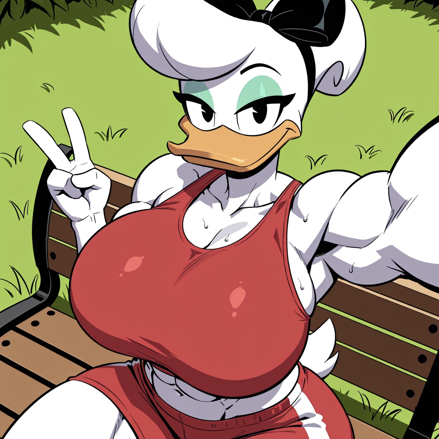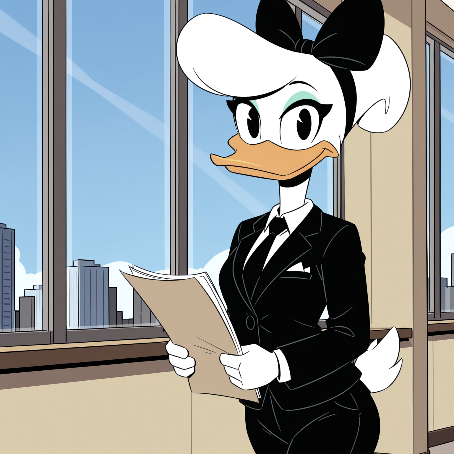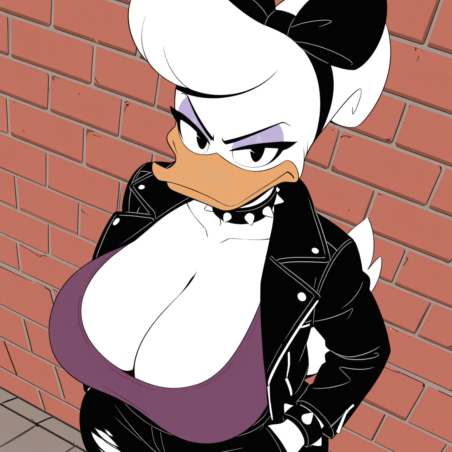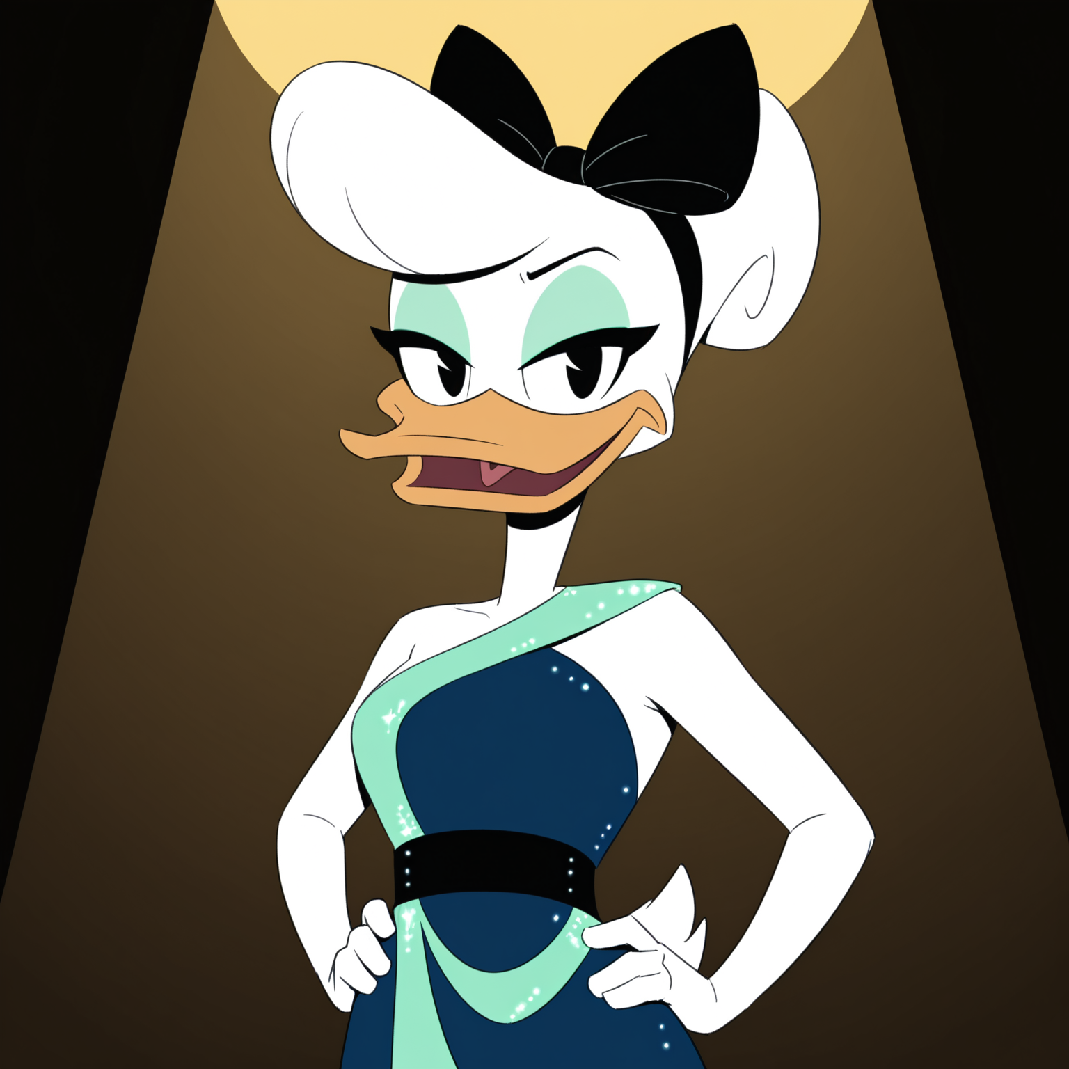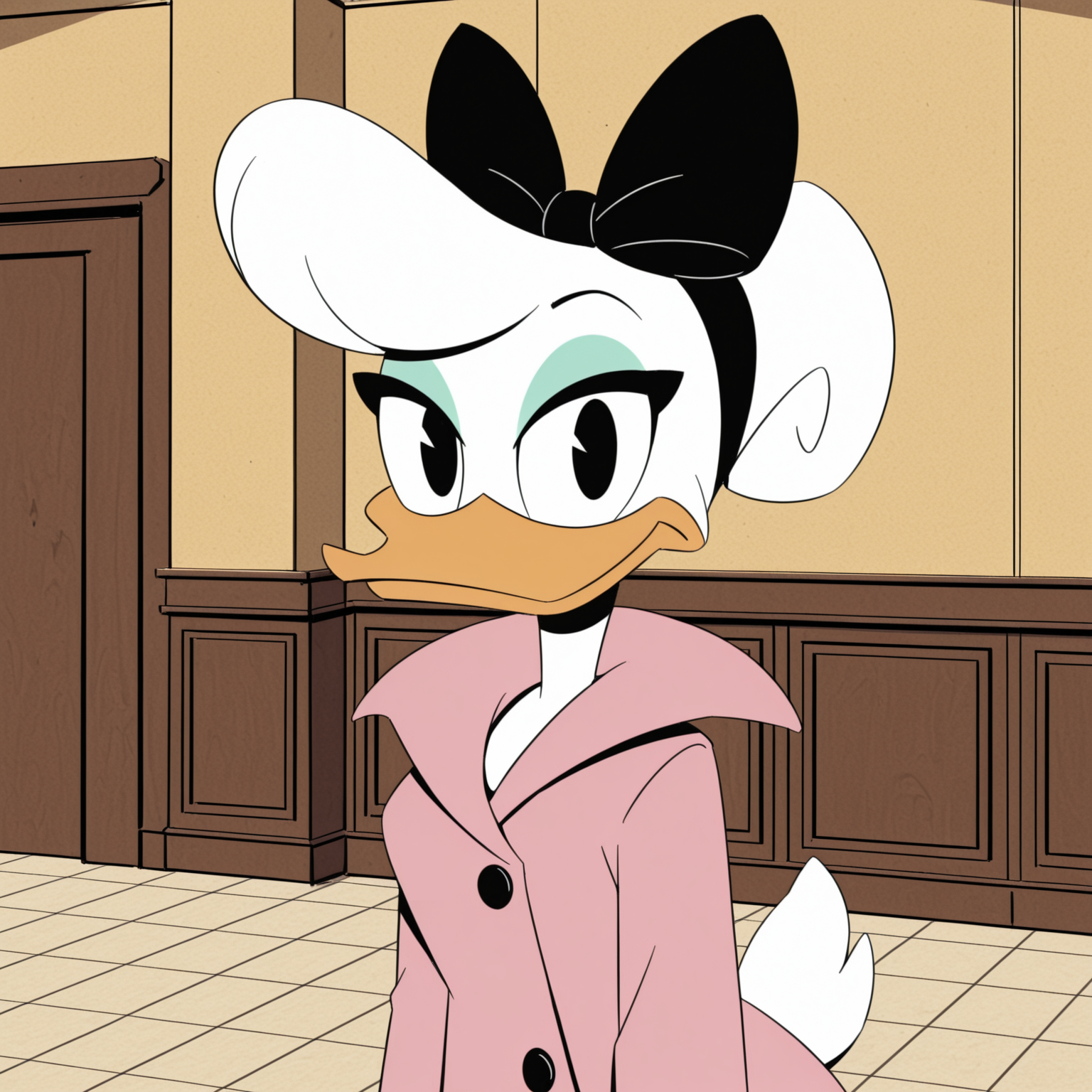 DuckTales 2017 애니메이션 시리즈의 데이지 덕. 이는 사용자의 요청으로 작성된 것입니다. LoRA는 캐릭터의 외모를 정확히 구현하지만 몇 가지 주의할 점이 있습니다. 그녀의 코트 의상은 일반적으로 평소보다 버튼이 더 많이 생성되며, 코트의 칼라 부분이 때때로 잘못 생성됩니다. 코트에 허리띠가 생성되면, "검은 머리 리본" 프롬프트를 제거하세요. 왜냐하면 제가 관찰한 바에 따르면, 그 리본을 제거했을 때만 허리 주변에 분홍색 리본이 생성되었기 때문입니다. 그녀의 반짝이 드레스는 절반의 경우 완벽하게 생성되지만, 나머지 경우 드레스에 파란색보다 녹색이 더 많이 나타납니다. 그녀의 머리를 풀어헤친 상태로 생성할 수 있지만, 다른 헤어스타일을 원한다면 가중치를 0.1~0.2로 낮추세요. 일반적인 가중치로 설정하면, 리본과 헤어 리본 프롬프트를 제거하거나 기본 헤어스타일과 원하는 스타일을 결합하더라도 항상 포니테일을 강제로 생성하려 합니다.