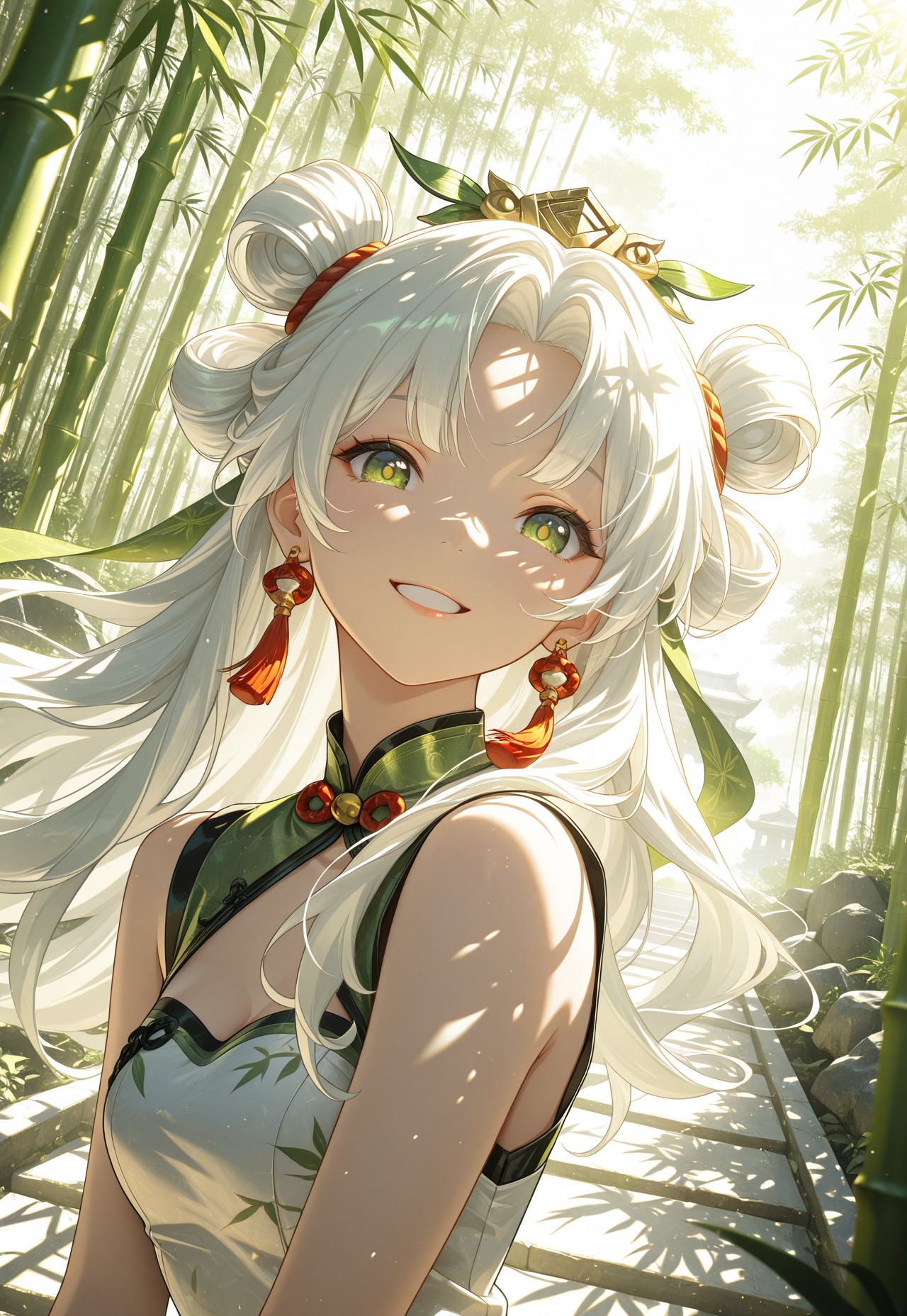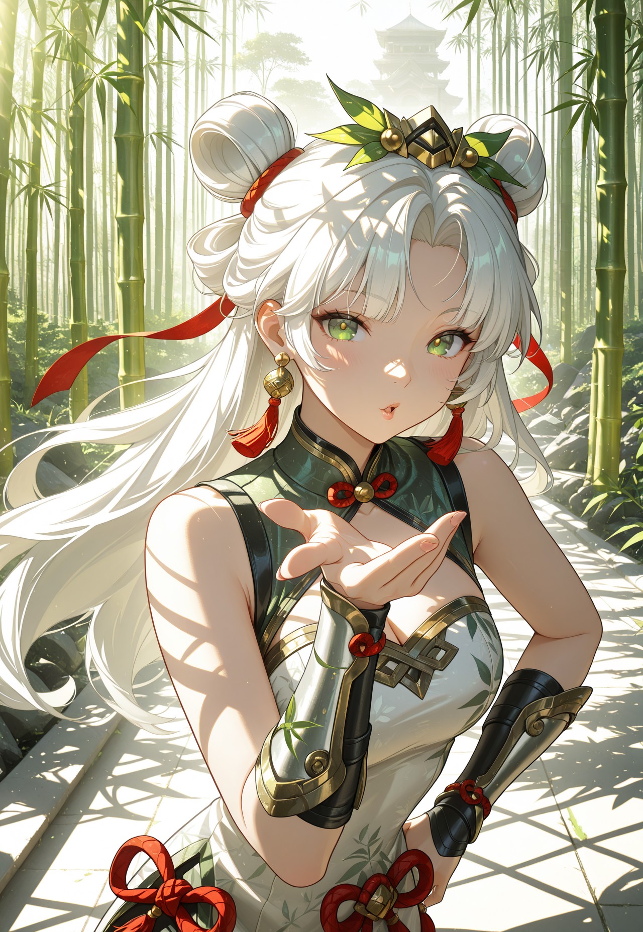 PPLux, long hair, white hair, hair buns, hair ornaments, green eyes, arm guards, bow, earrings, sleeveless dress, multicolored dress, chinese style short dress, red ribbon bow, thighhighs stockings, staff,