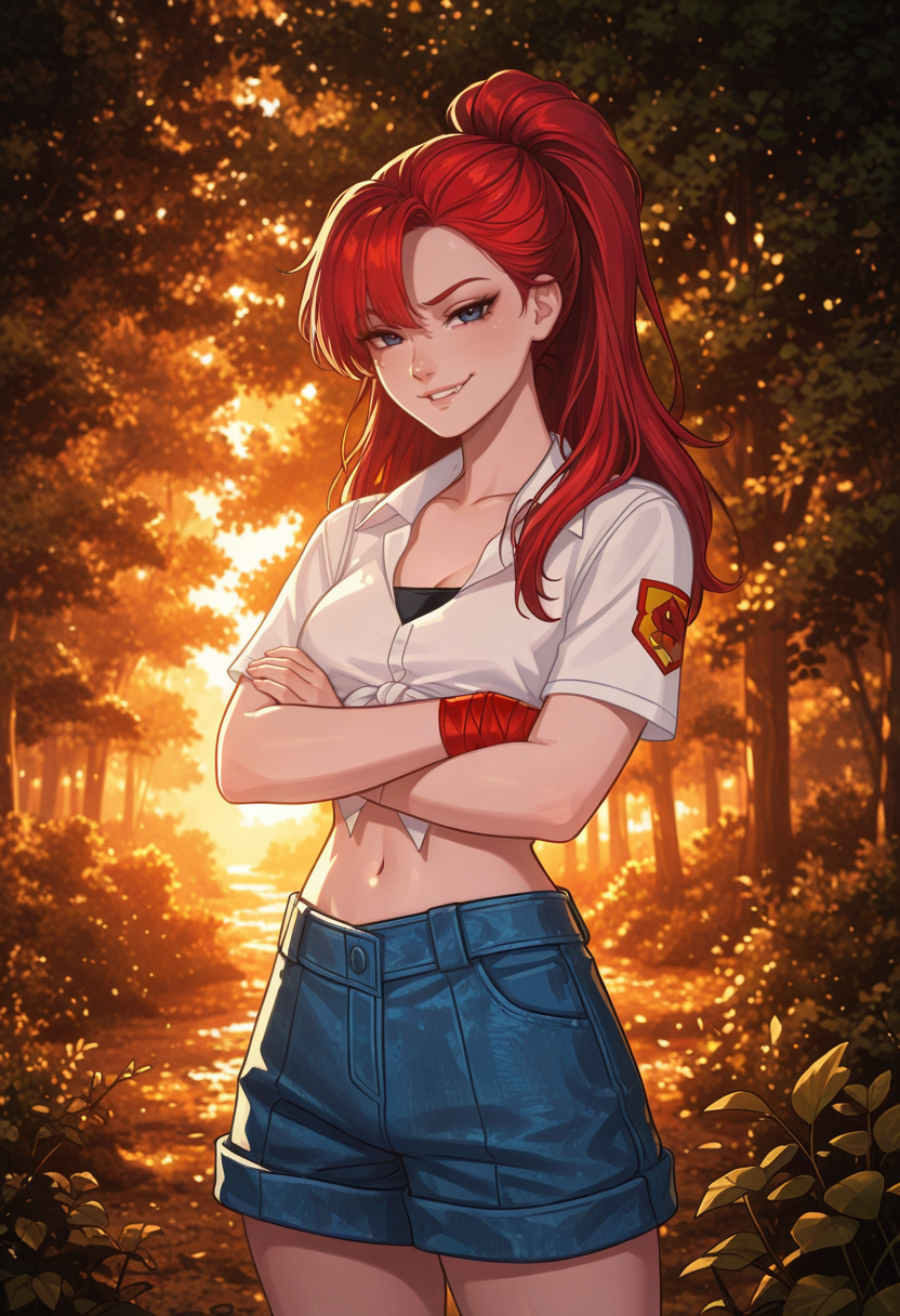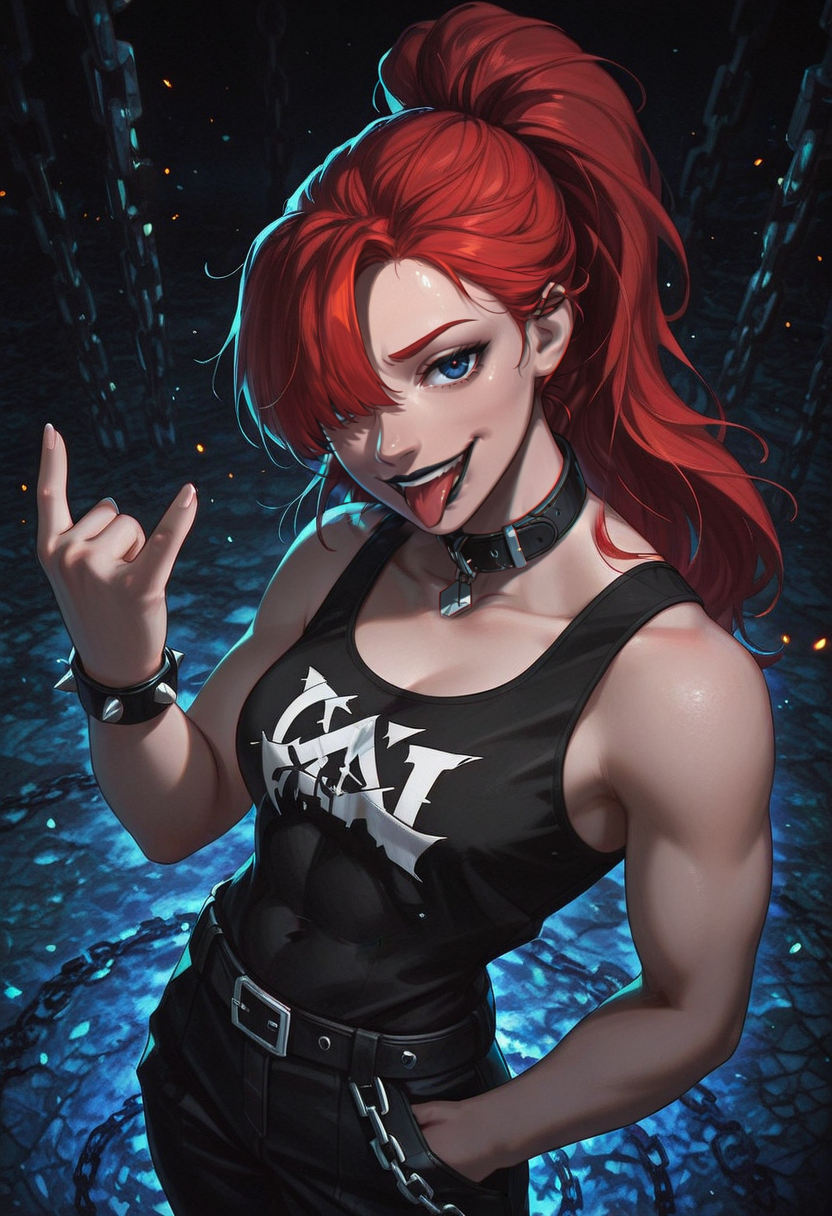 red hair, long hair, high ponytail, bangs, dark blue eyes,