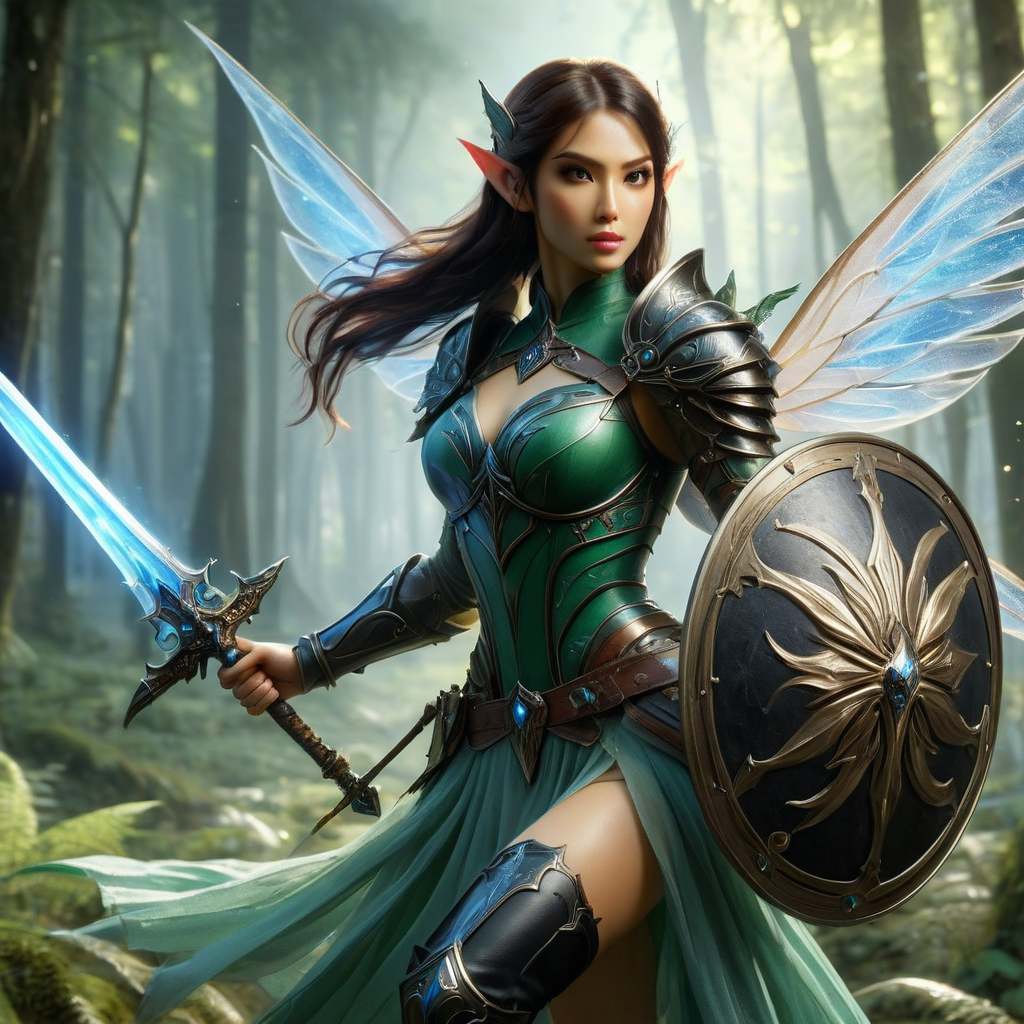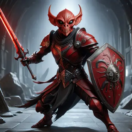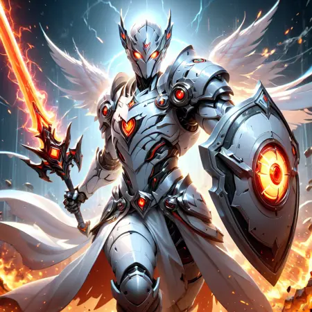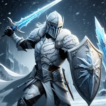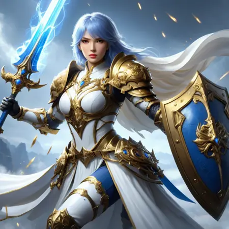 • Flux 버전의 경우, 검과 방패를 들고 있는 상황을 설명하면 더 좋은 결과를 얻을 수 있습니다. 예시 프롬프트를 참조하세요.