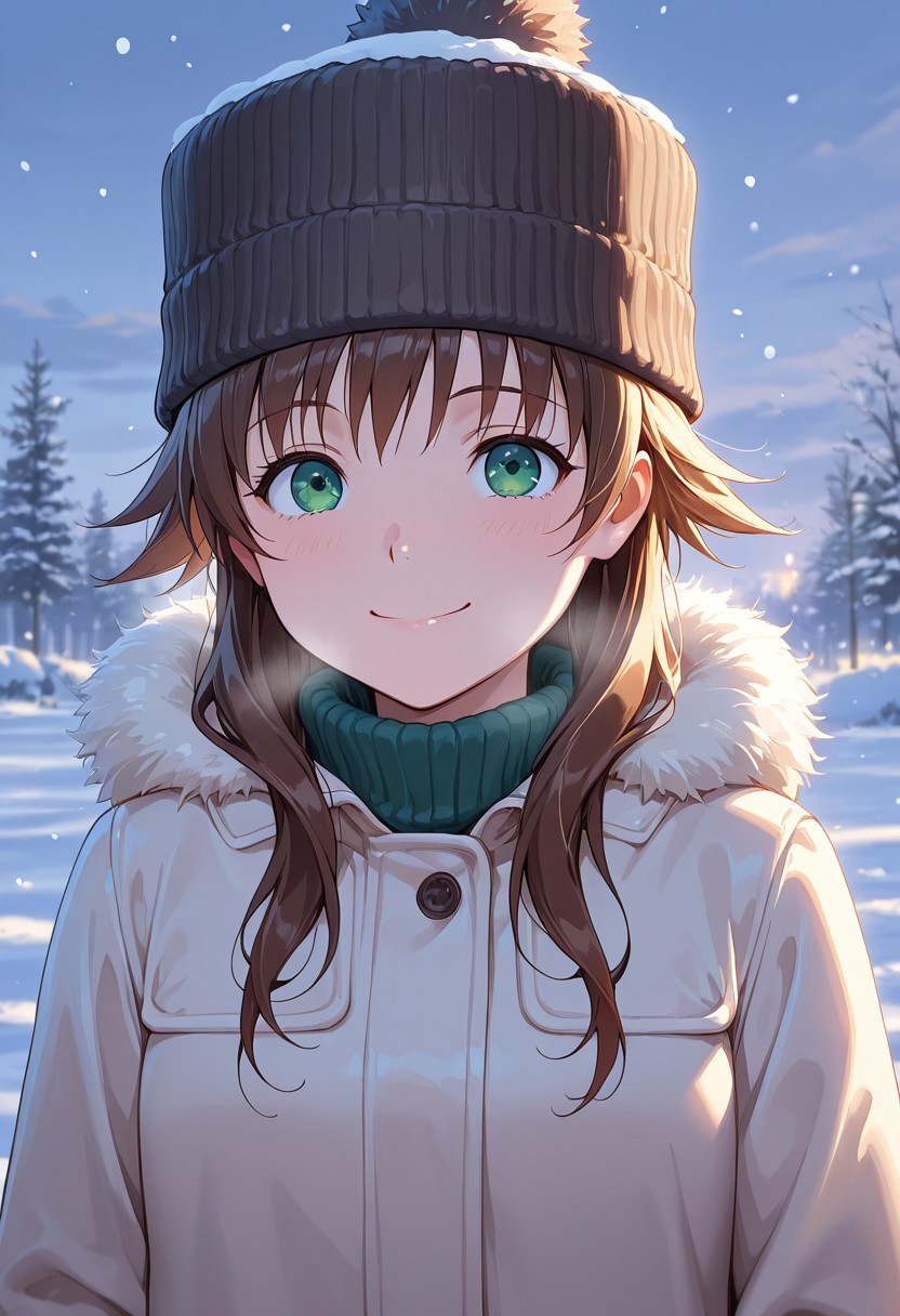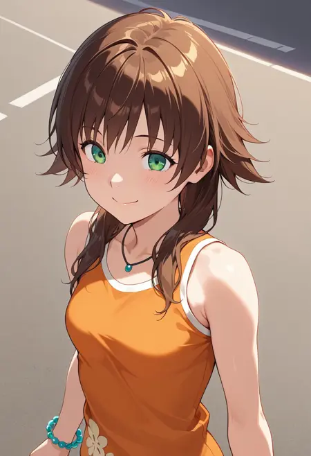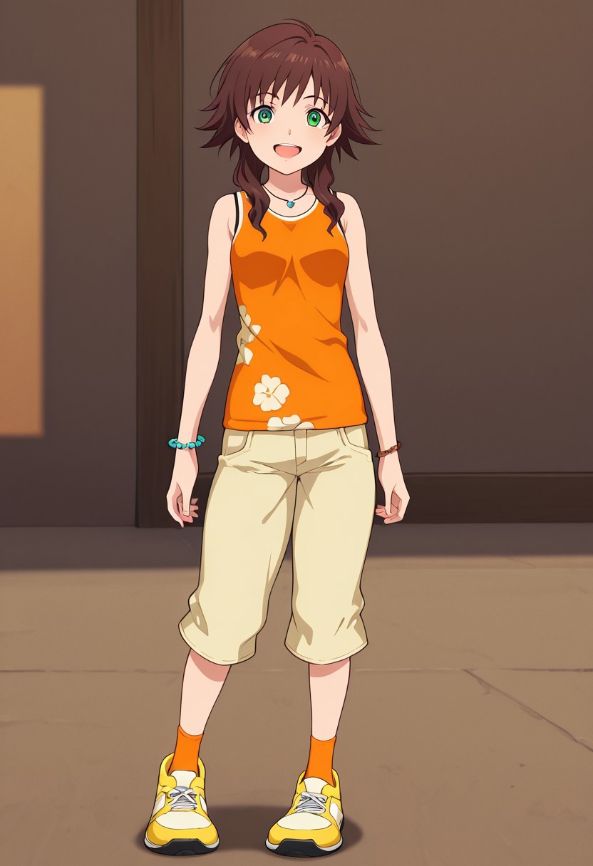 1girl, solo, green eyes, brown hair, long hair, necklace, orange shirt, sleeveless, bracelet, brown pants, capri pants, orange socks, sneakers, yellow footwear,