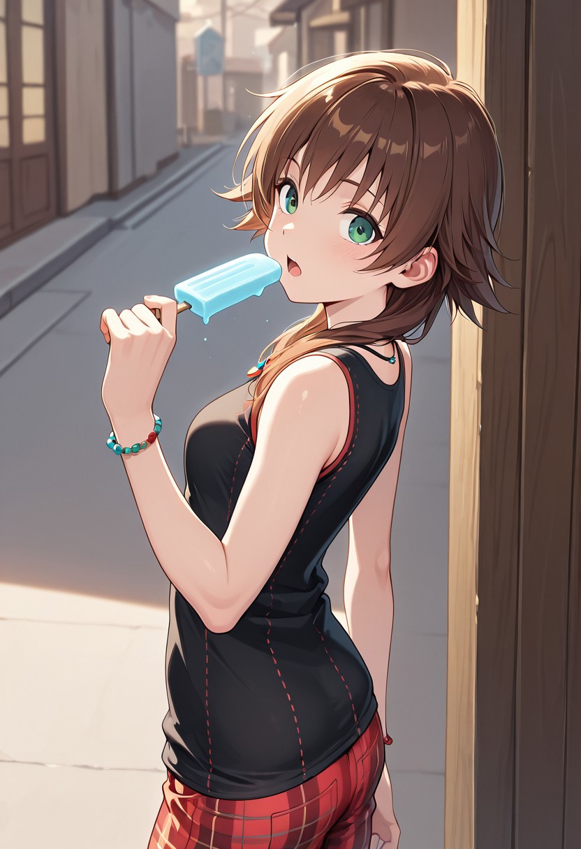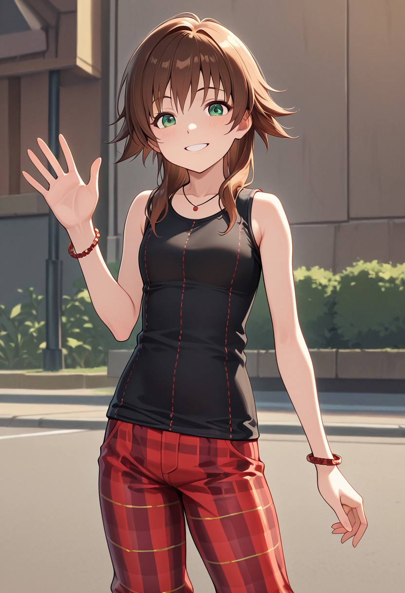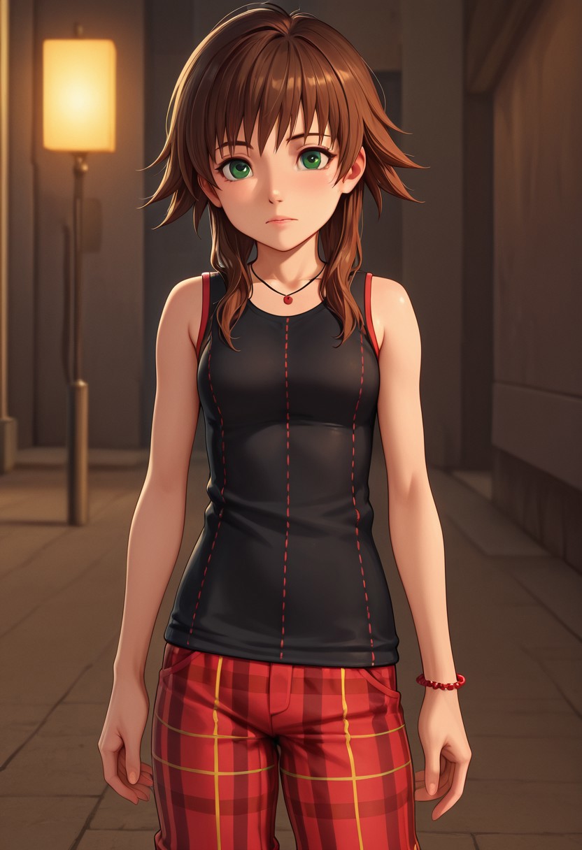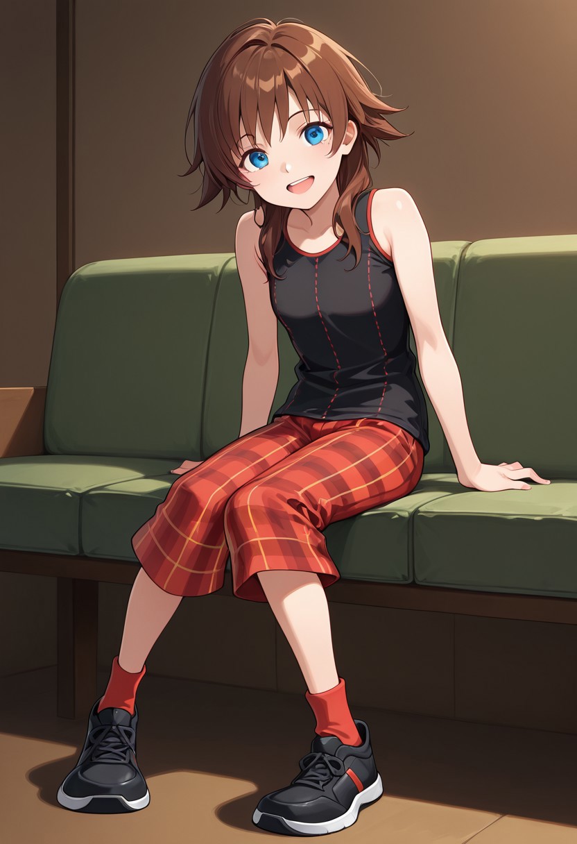 1girl, solo, green eyes, brown hair, long hair, necklace, black shirt, sleeveless, bracelet, red pants, plaid pants, capri pants, red socks, sneakers, black footwear,