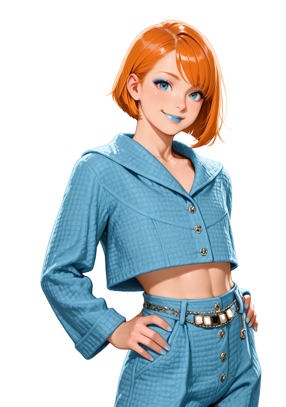"blue cotton_tweed jacket" 하나만 트리거 단어로 사용해도 LoRa가 잘 작동하지만, 더 정확한 결과를 얻으려면 "blue cotton_tweed skirt"도 함께 사용할 수 있습니다.