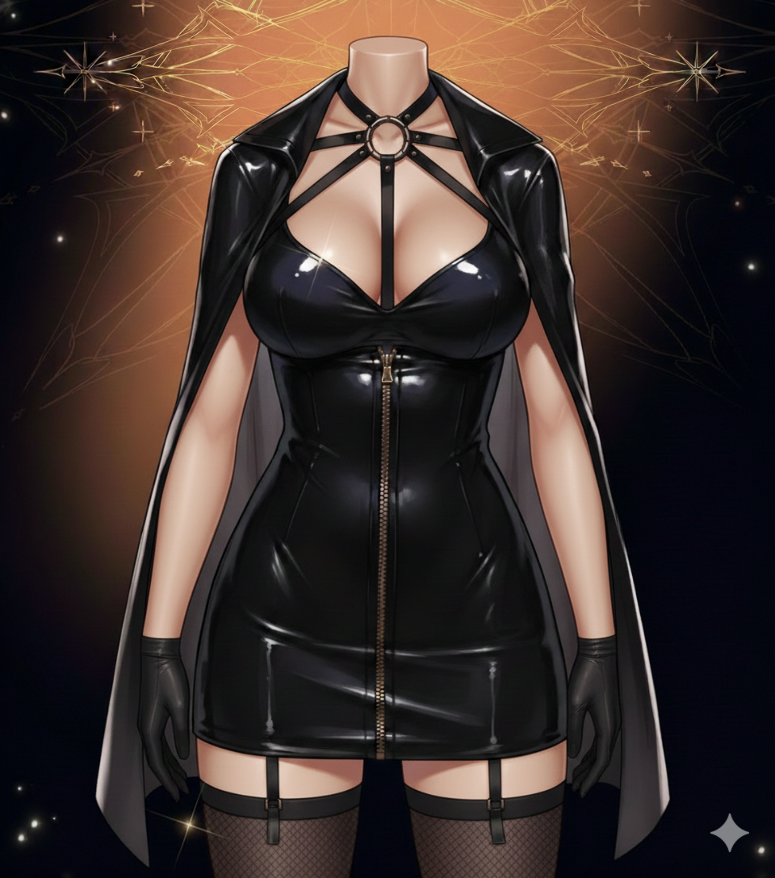 이 룩은 어깨에서 흐르는 긴 플로잉 캐프로 완성되며, 강렬한 수직선과 드라마틱한 움직임을 창출합니다. 팔꿈치 길이의 장갑, 허벅지까지 오는 스타킹, 그리고 거터 스트랩은 의상의 피티시 패션 정체성을 강화하면서도 일관되고 우아한 구조를 유지합니다. 전반적인 스타일은 어두운 우아함, 유혹적인 권위, 하이패션 피티시웨어를 융합하며, 광택 있는 소재, 몸에 딱 맞는 핏, 드라마틱한 연출에 강조를 둡니다.