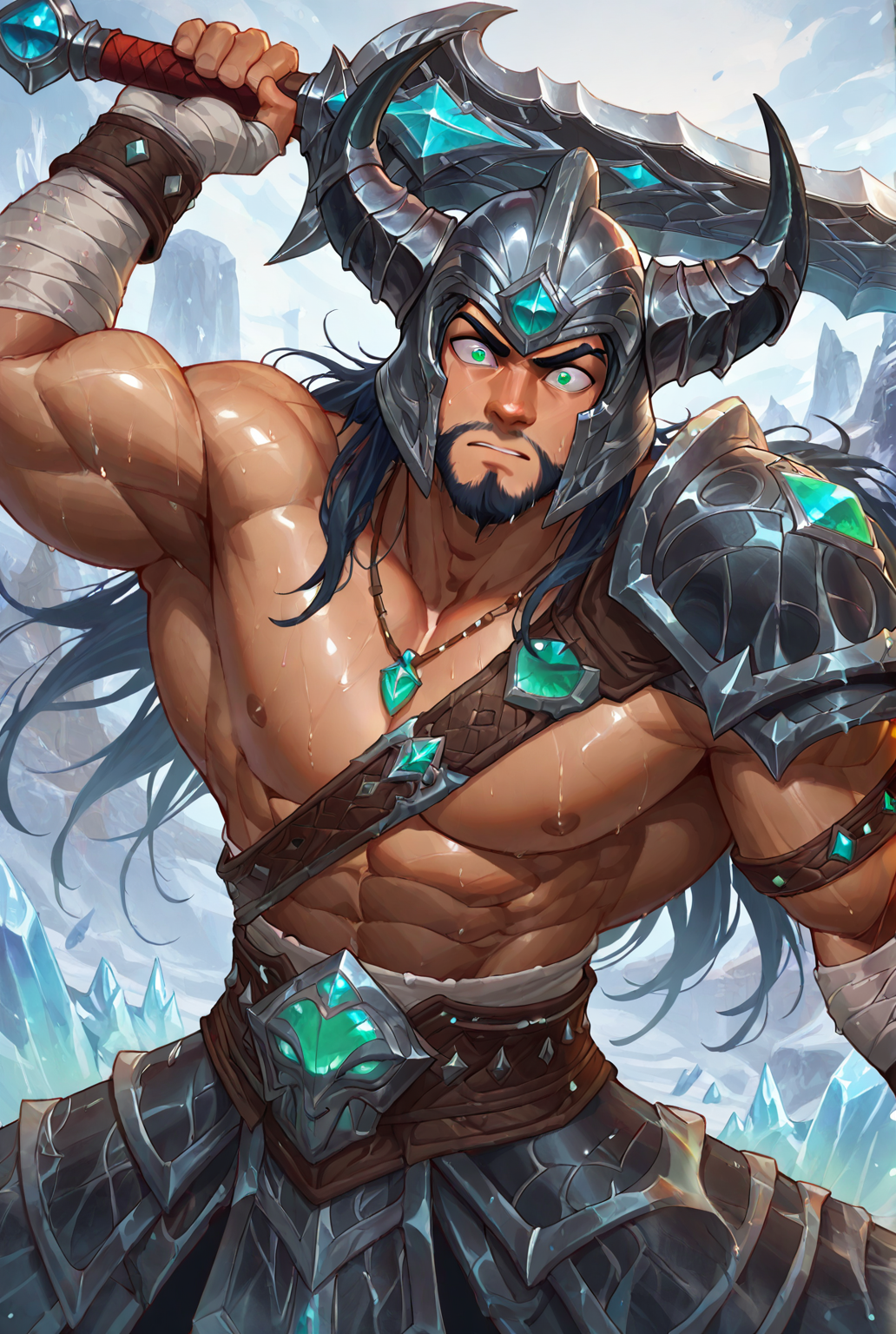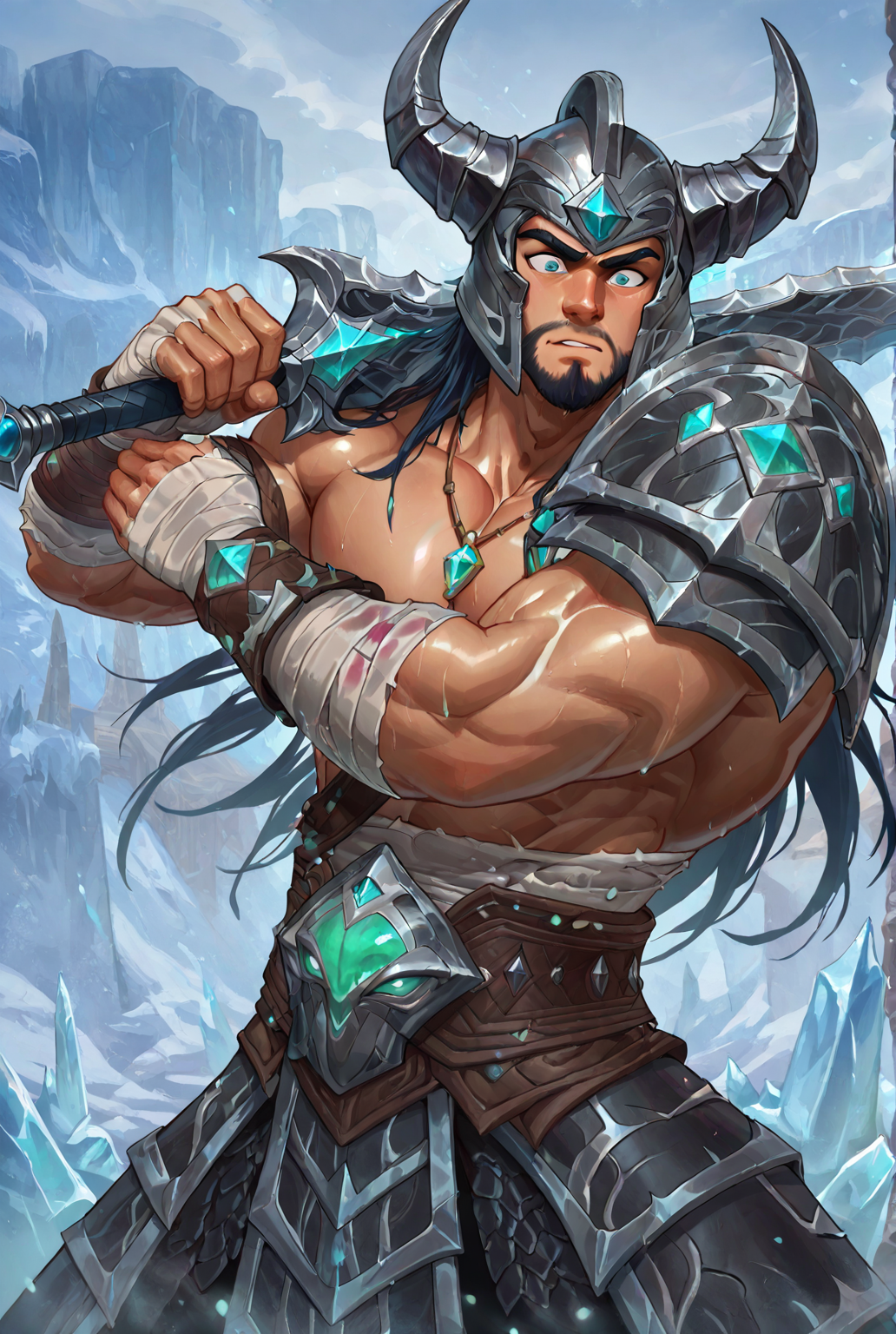 trynd4mere, armor, muscular, muscular male, long hair, jewelry, necklace, facial hair, bara, helmet, horned helmet, horns, fake horns, shoulder armor, pectorals, bandaged arm, bandages, belt