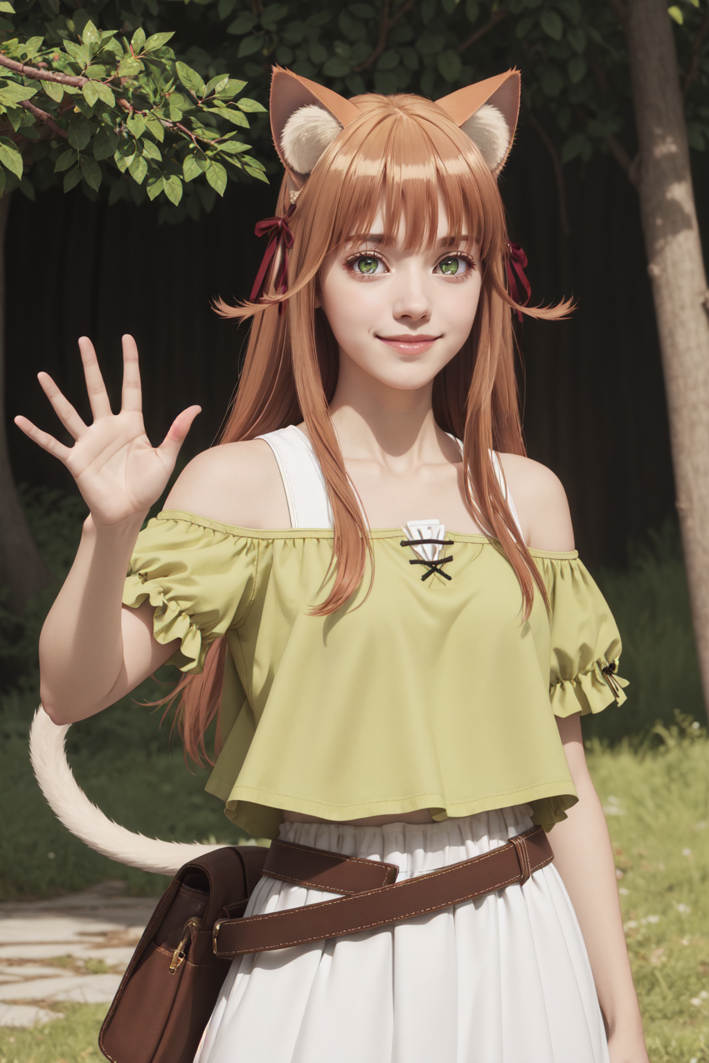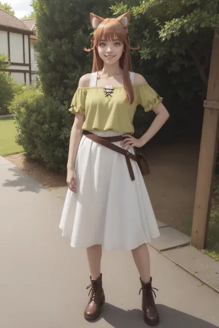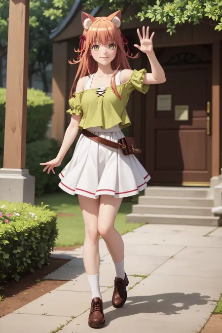 옷차림: 어깨 노출, 녹색 셔츠, 짧은 소매, 흰 치마, 고양이 꼬리, 갈색 벨트, 신발