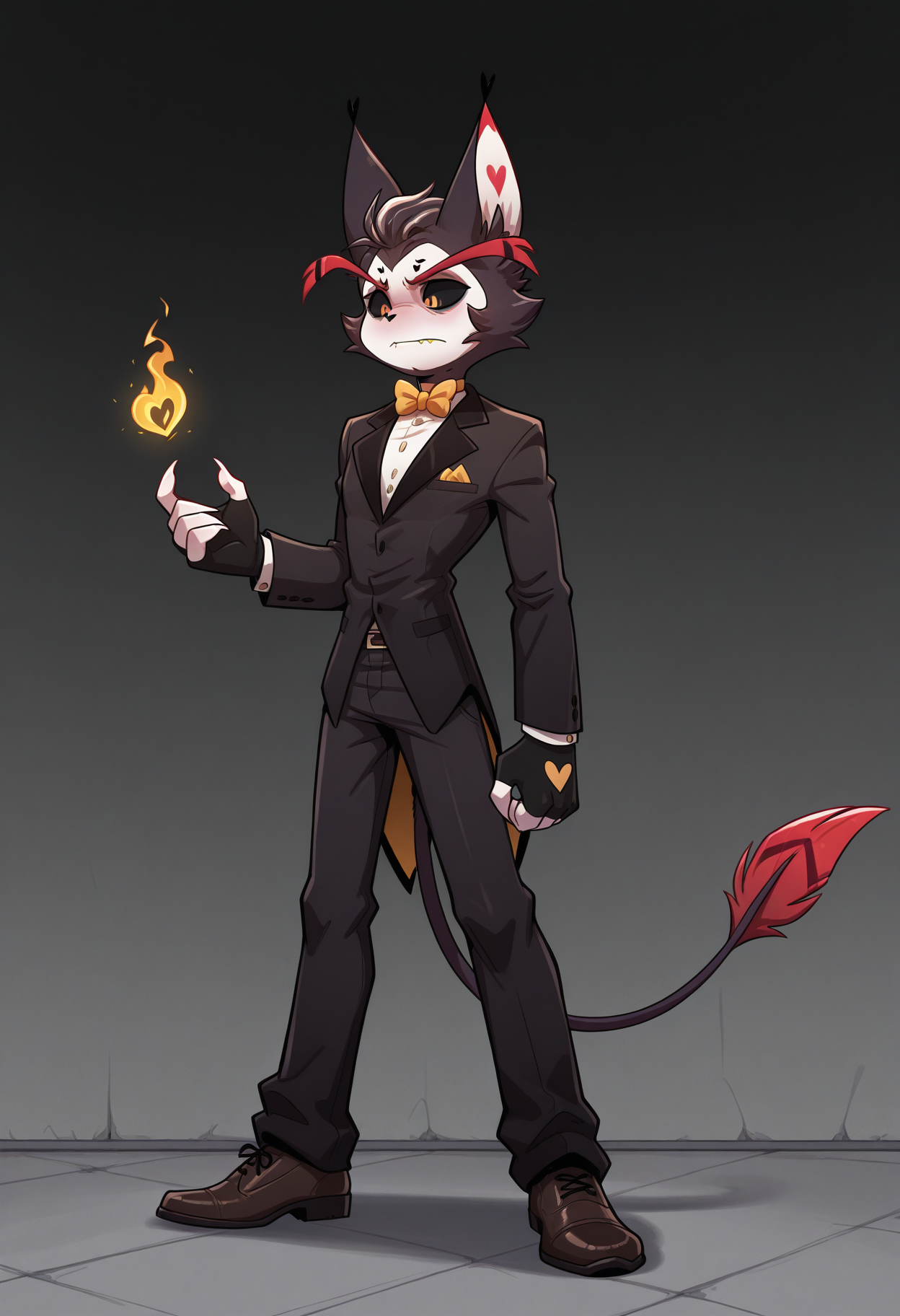 トリガー語: huskO、猫の悪魔、色付きの虹彩、黄色い目、メインの衣装: 黄色いボウタイ、黒いスーツ、指なし手袋、