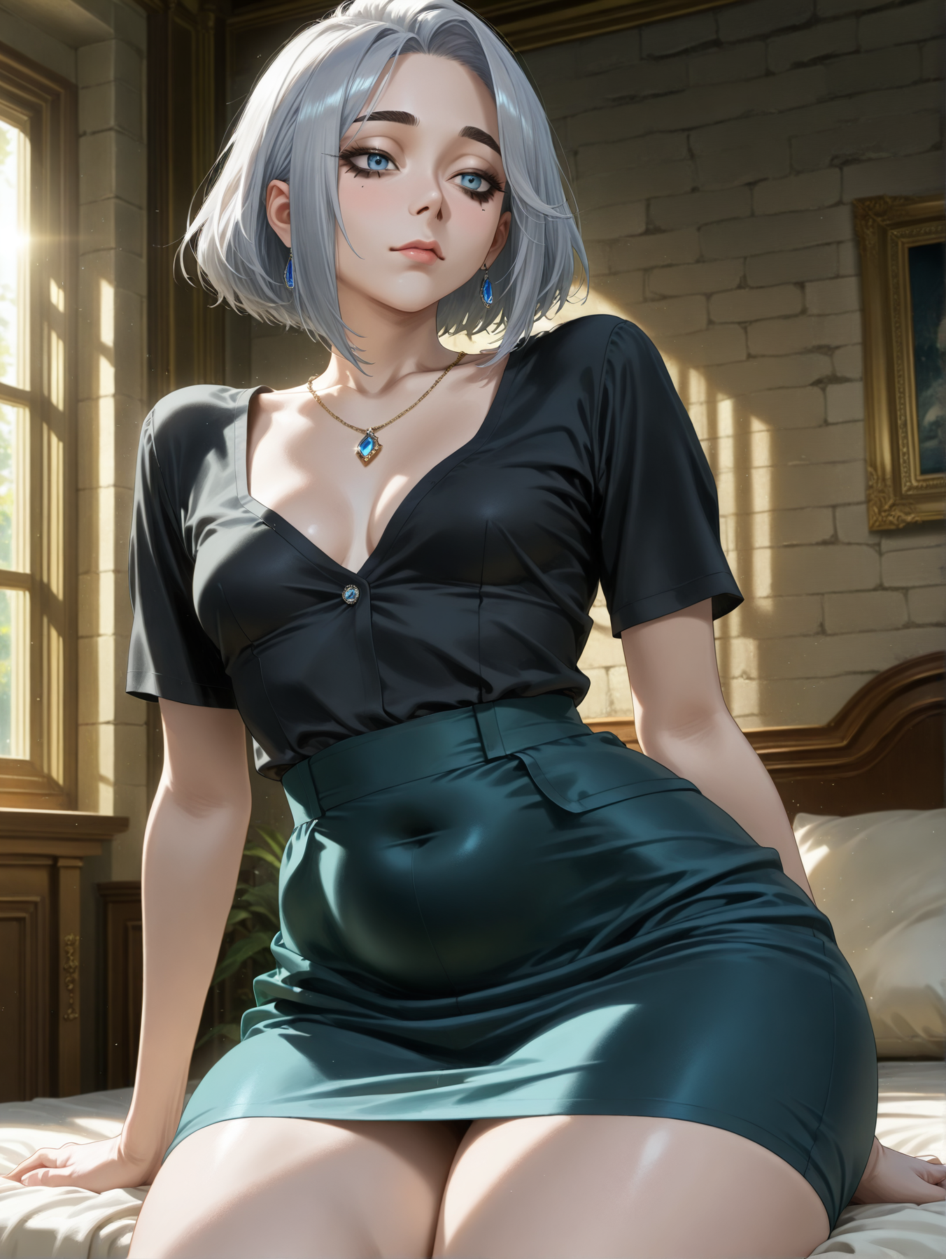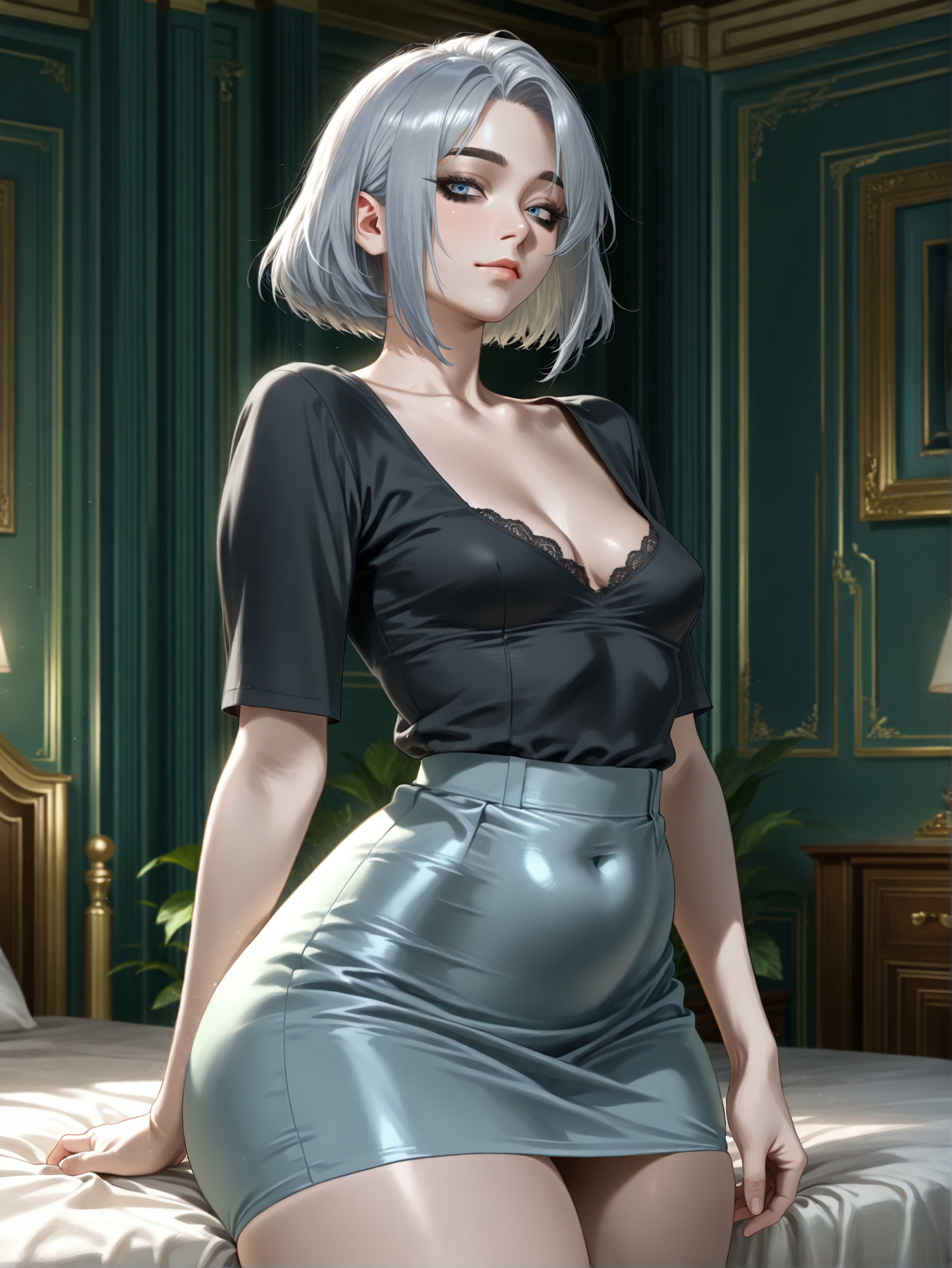 emilia3_5_1, 영화적인 침실 조명, 깊은 V넥 검은 블라우스,