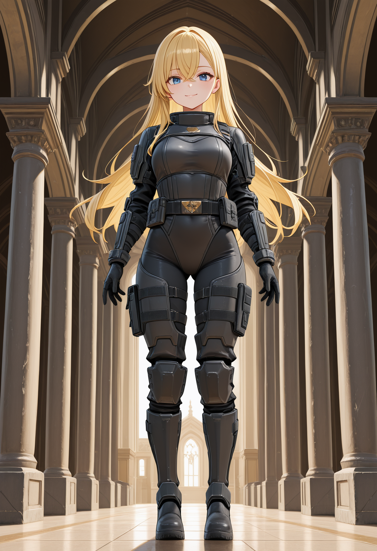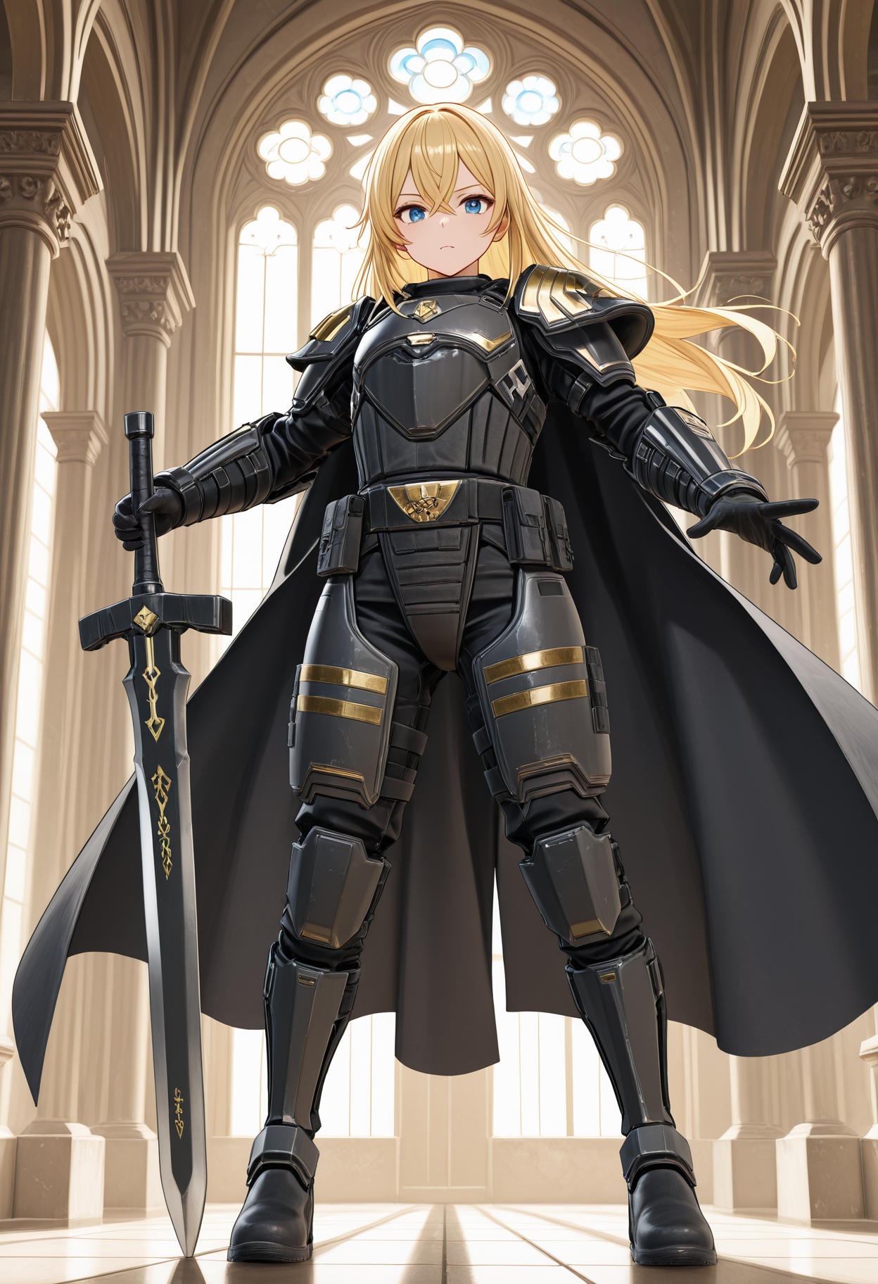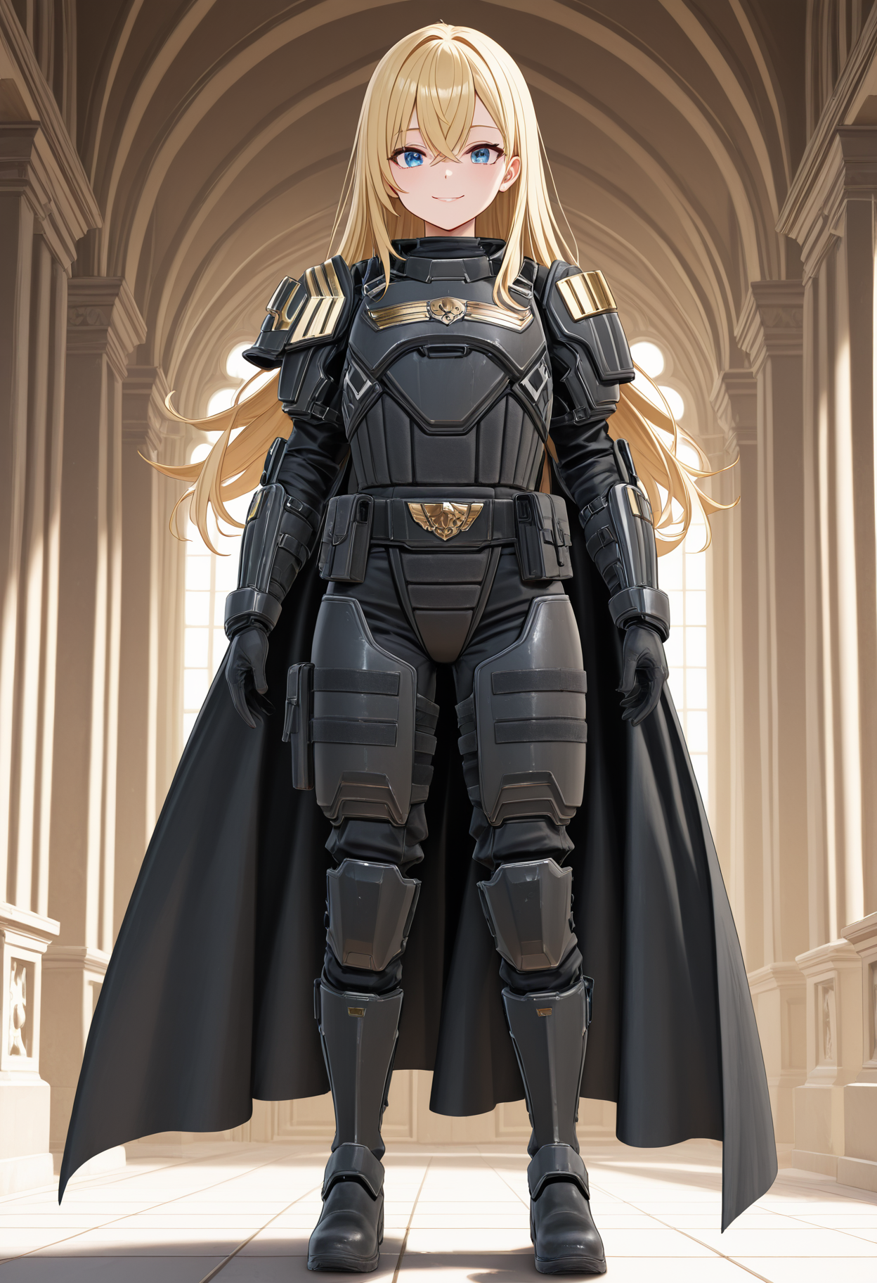 black cuirass,cuirass,tactical pouches on belt,asymmetrical shoulder armors,ornate shoulder armor,simple shoulder armor,black vambraces,vambraces,black tactical thigh panels,tactical thigh panels,black greaves,greaves,