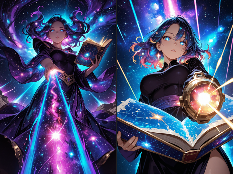 "masterpiece, best quality, very aesthetic, absurdres, 1girl, solo, cosmic entity, sorceress, nebula hair, multicolored hair, sparkling hair, glowing starry eyes, looking at viewer, from below, low angle, floating in space, holding book, star map book, firing, energy beam, cosmic beam, galaxy beam, swirling stars, colorful beam, stardust, lens flare, aiming at viewer, foreshortening, vibrant colors, cinematic lighting, hkblast"