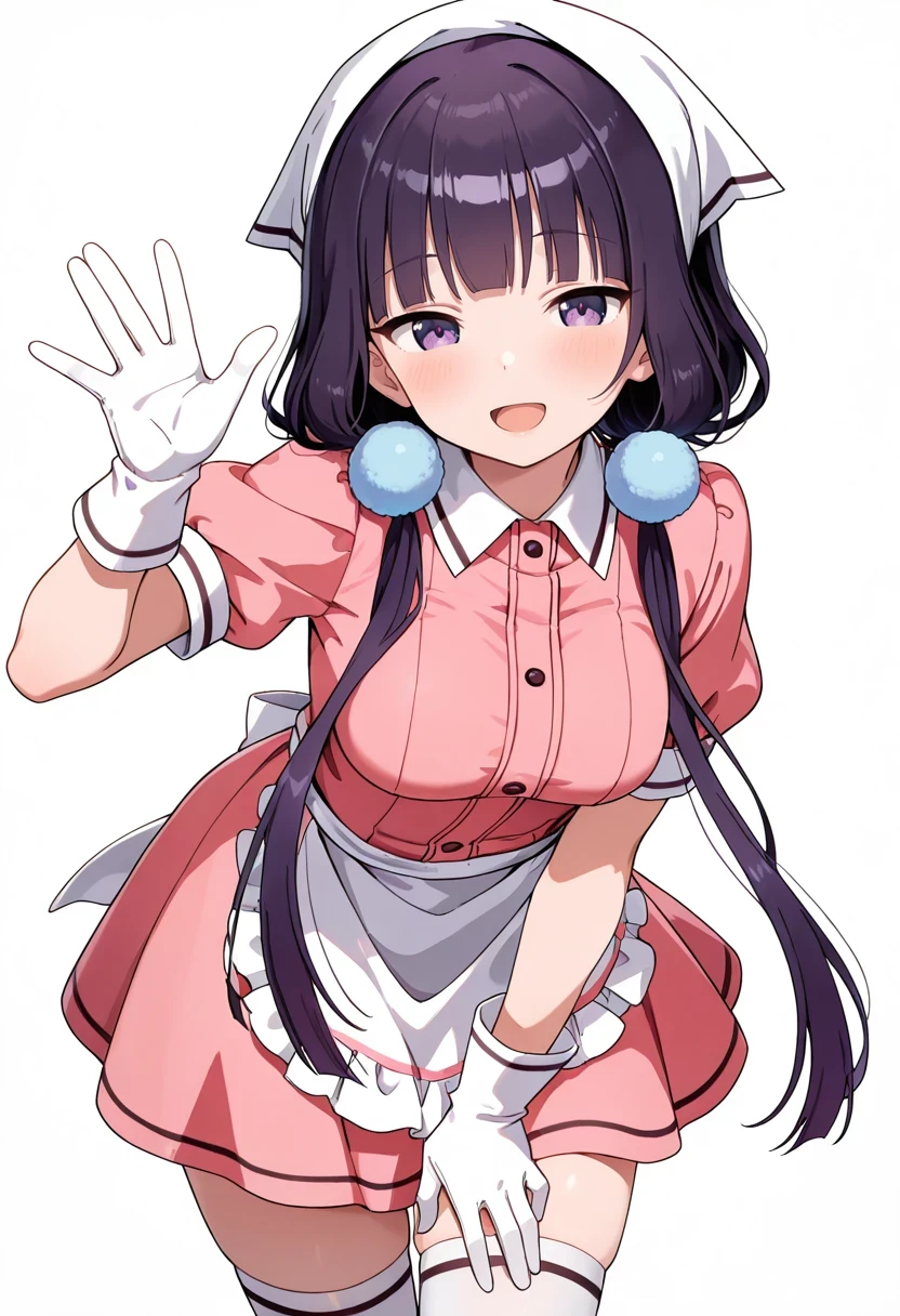 頭巾,白い手袋,襟付きのドレス,ピンクのドレス,ウエストエプロン,白いタイツ,