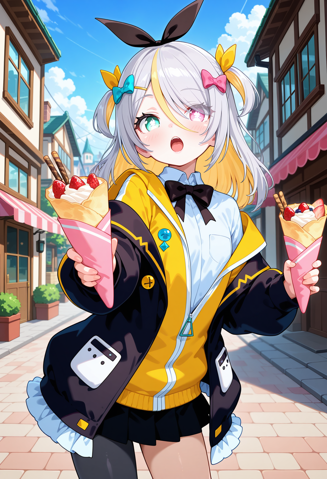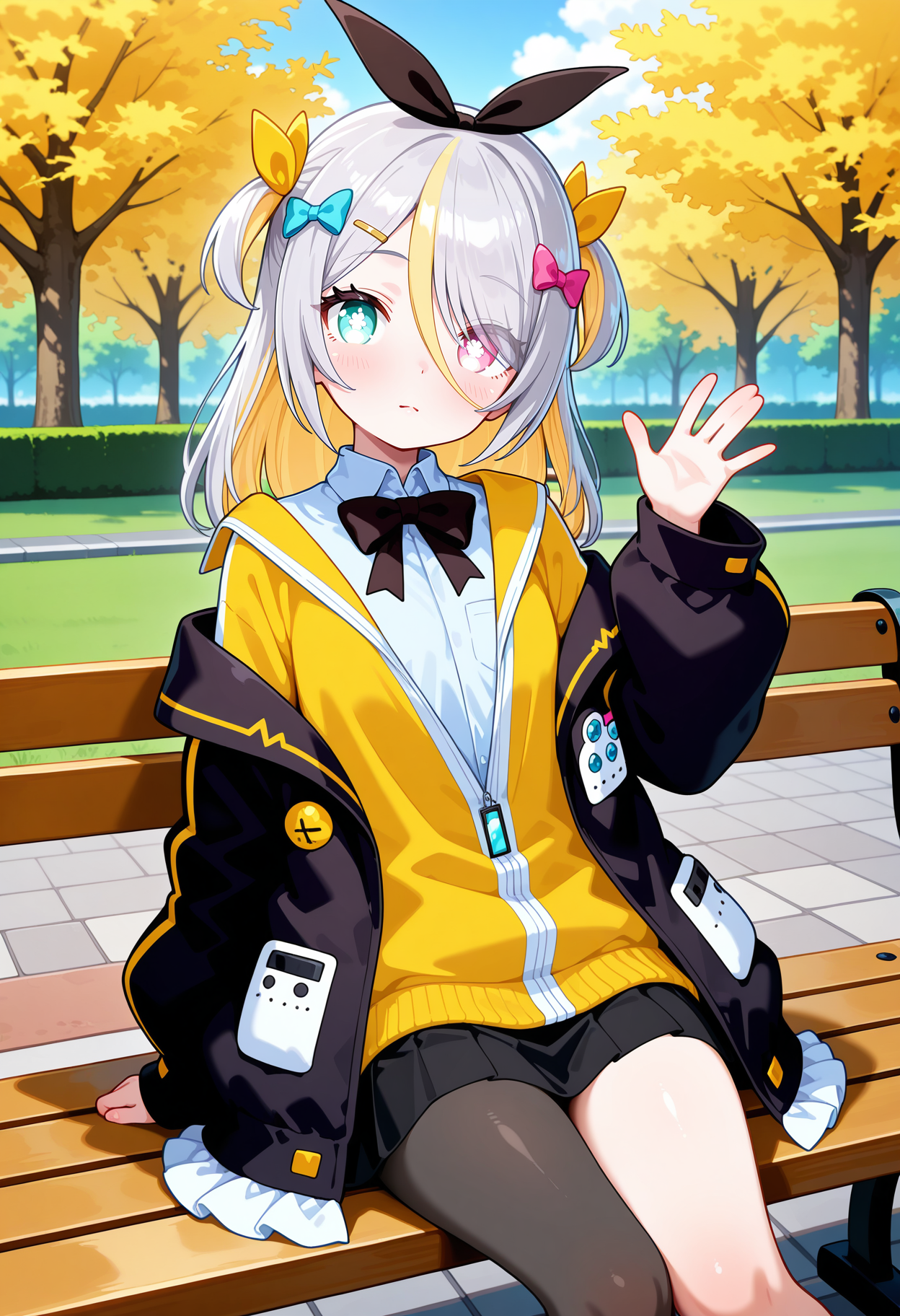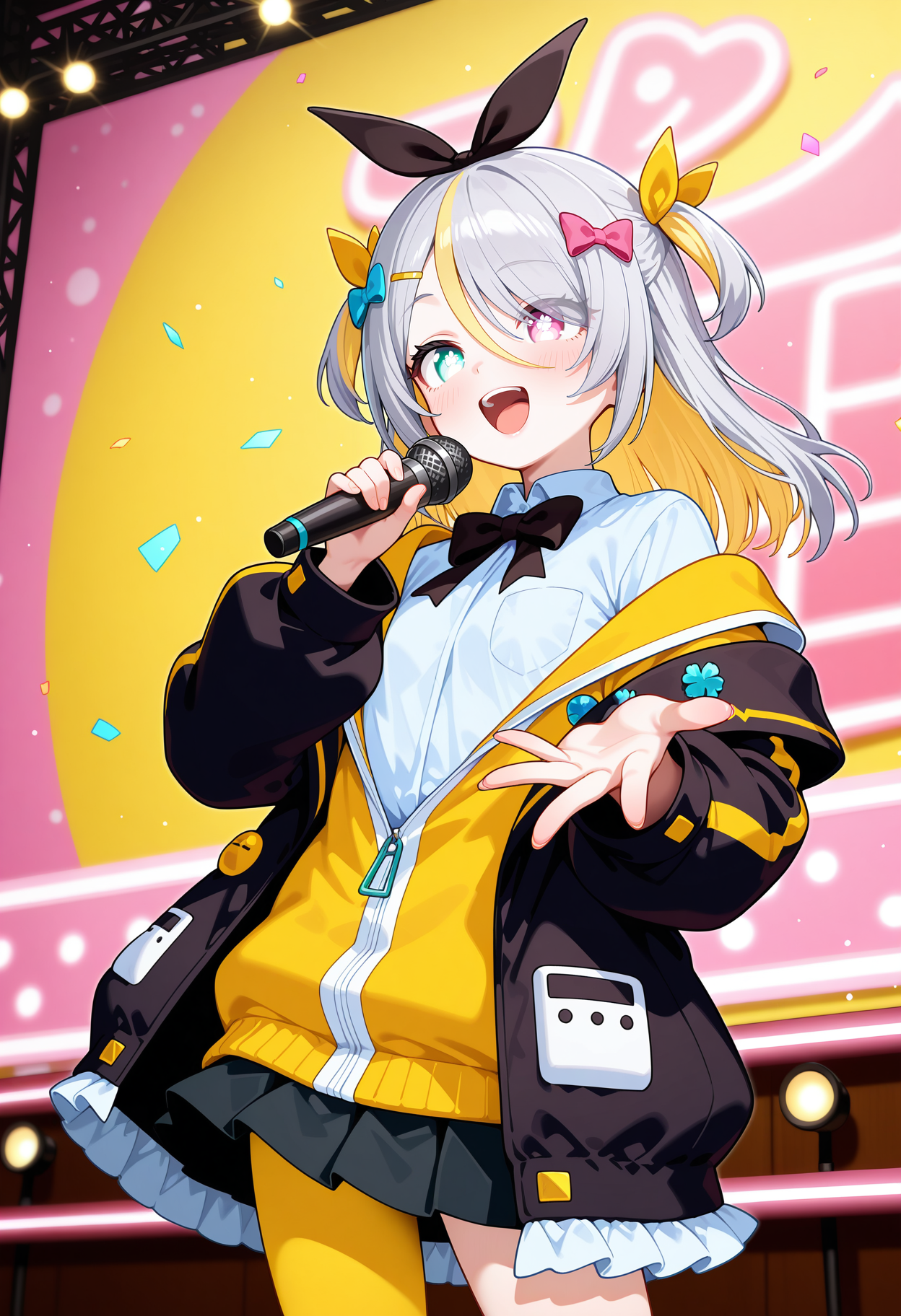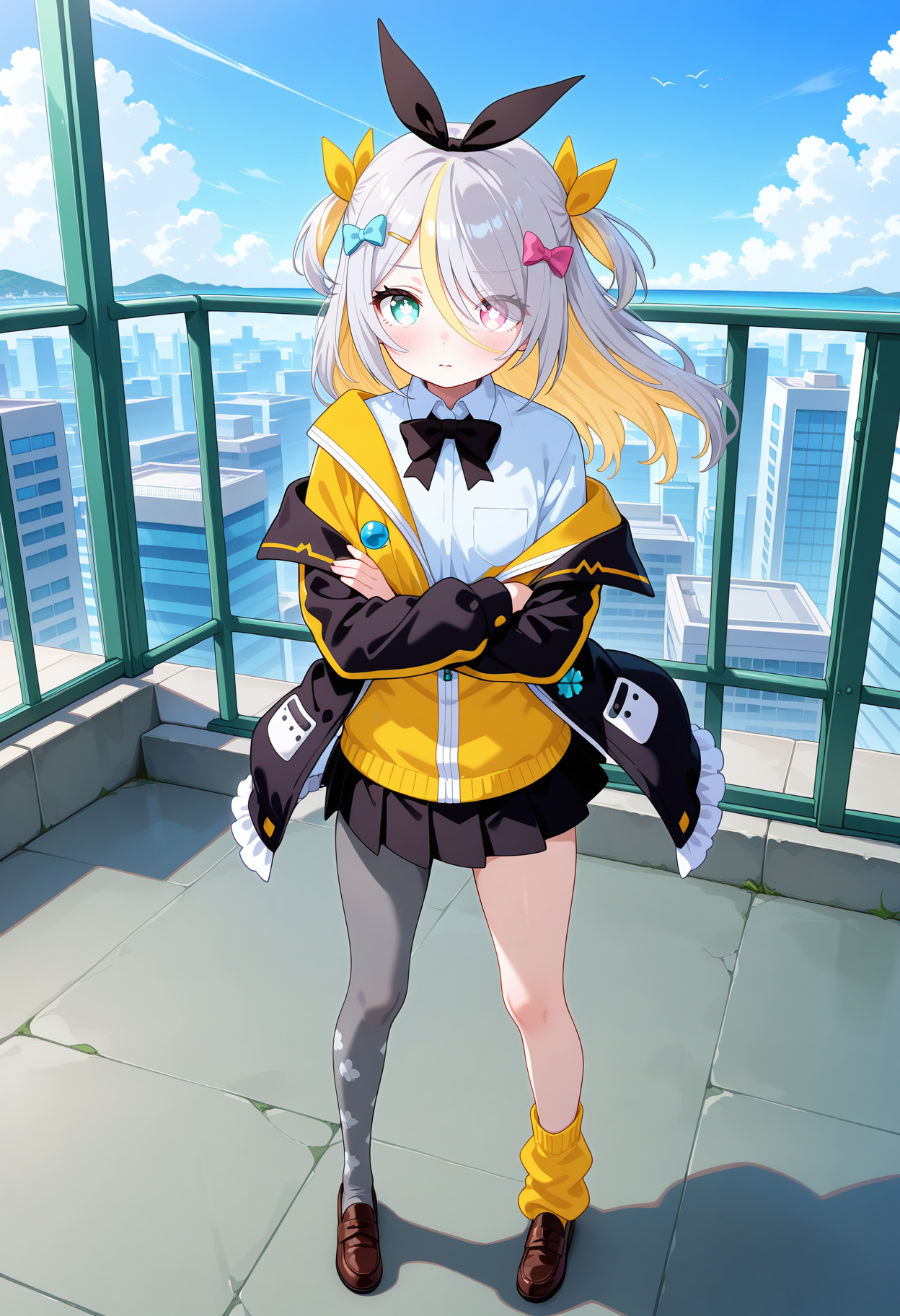 outfit1aapurin, long hair, multicolored hair, grey hair, two side up, hair bow, hair ribbon, hairclip, heterochromia, black bowtie, white shirt, yellow jacket, layered clothes, off shoulder, black jacket, long sleeves, black skirt, single leg pantyhose
