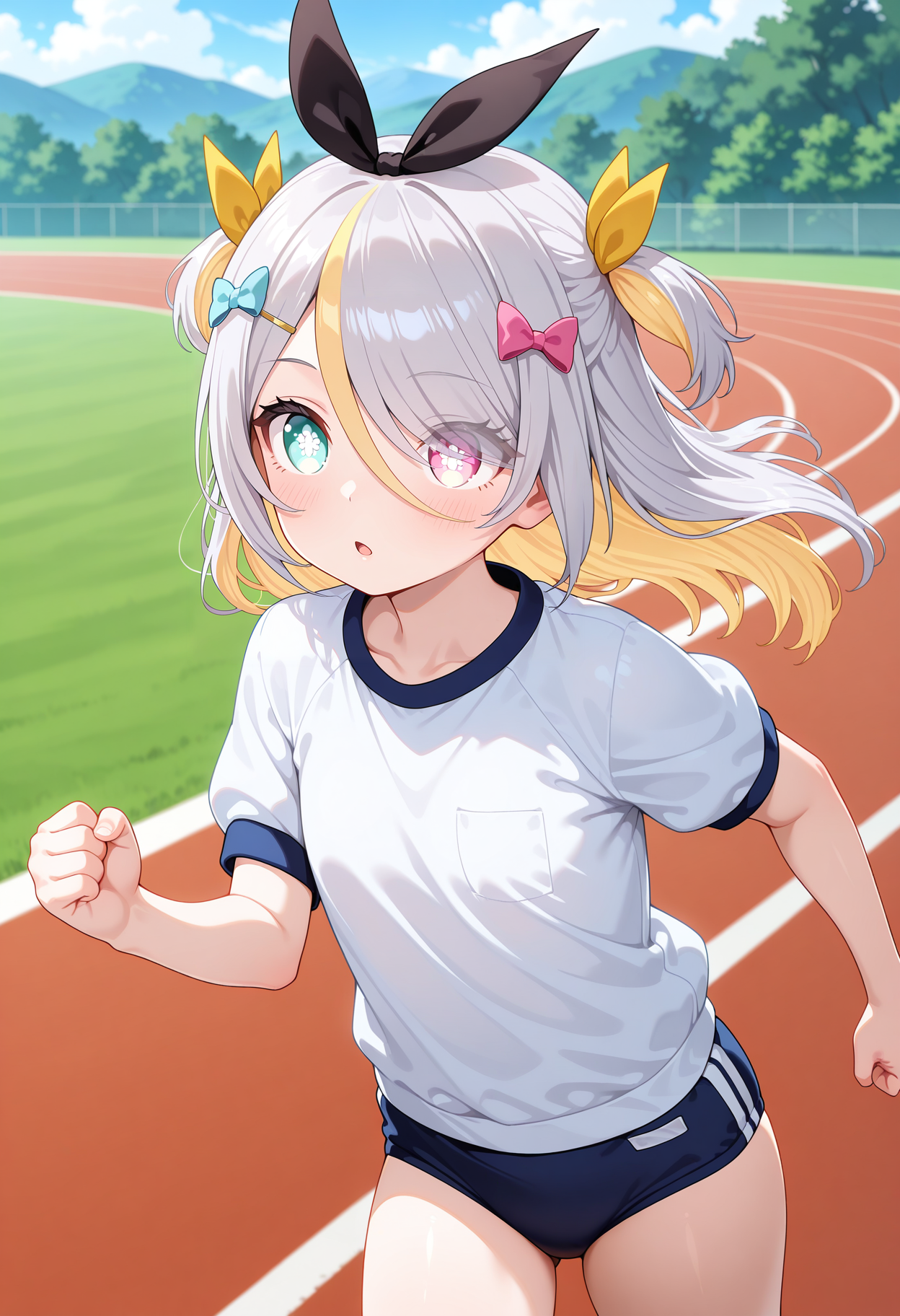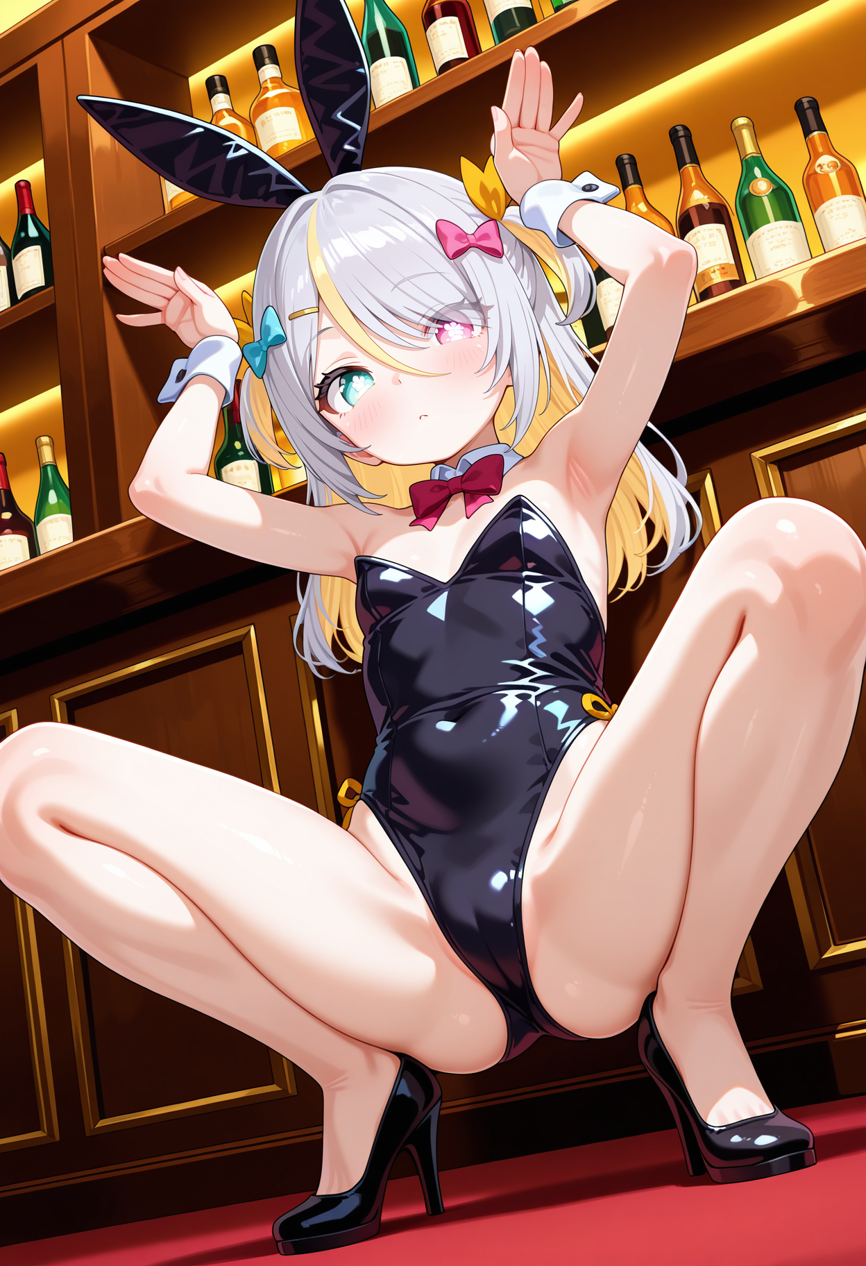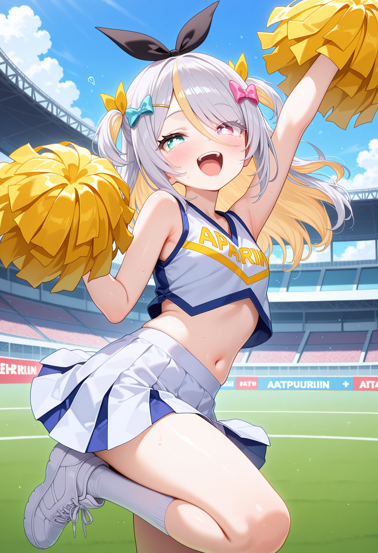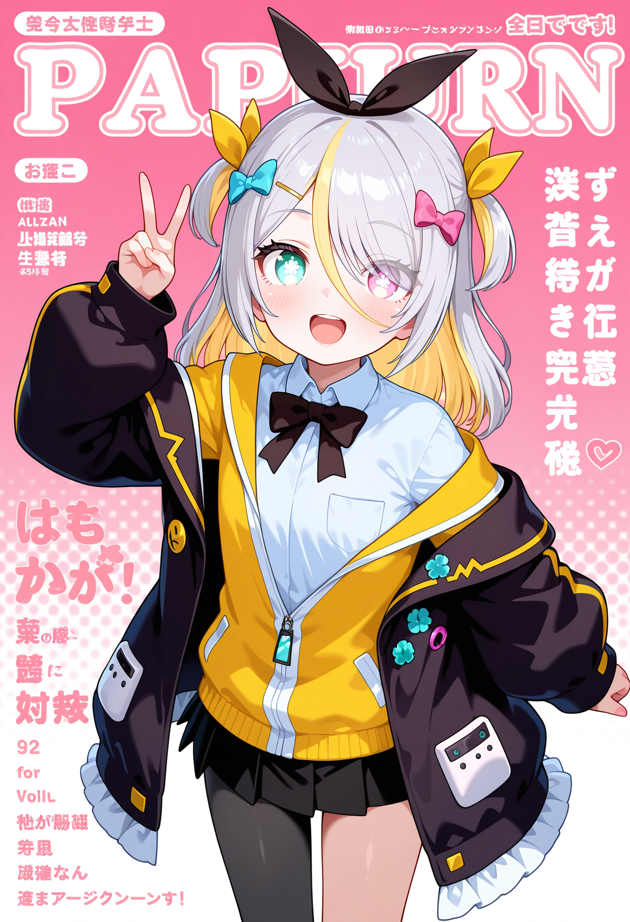 outfit1aapurin, long hair, multicolored hair, grey hair, two side up, hair bow, hair ribbon, hairclip, heterochromia, black bowtie, white shirt, yellow jacket, layered clothes, off shoulder, black jacket, long sleeves, black skirt, single leg pantyhose