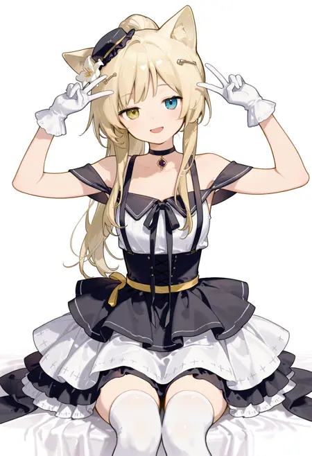 yemo002, 1 girl, solo, cat ears, mini hat, black headwear, hair flower, long hair, ponytail, heterochromia, blue eyes, yellow eyes, light blonde hair, bare shoulders, black choker, white dress, off-shoulder dress, layered dress, sleeveless dress, white gloves, white thighhighs