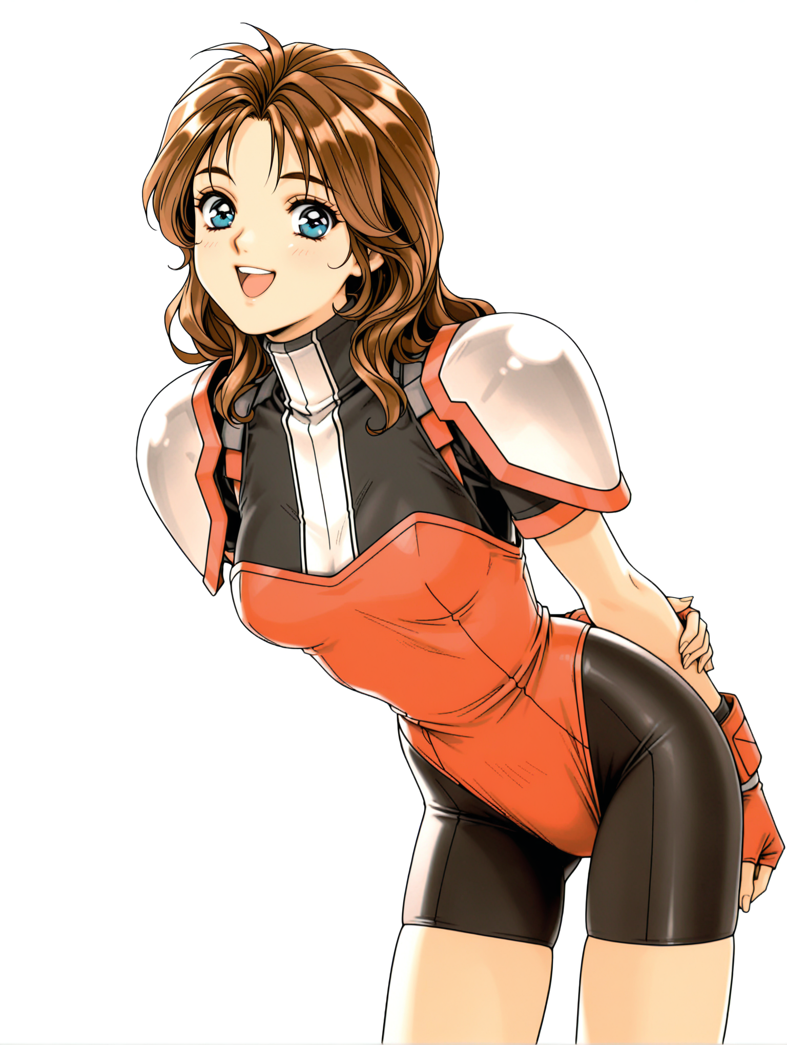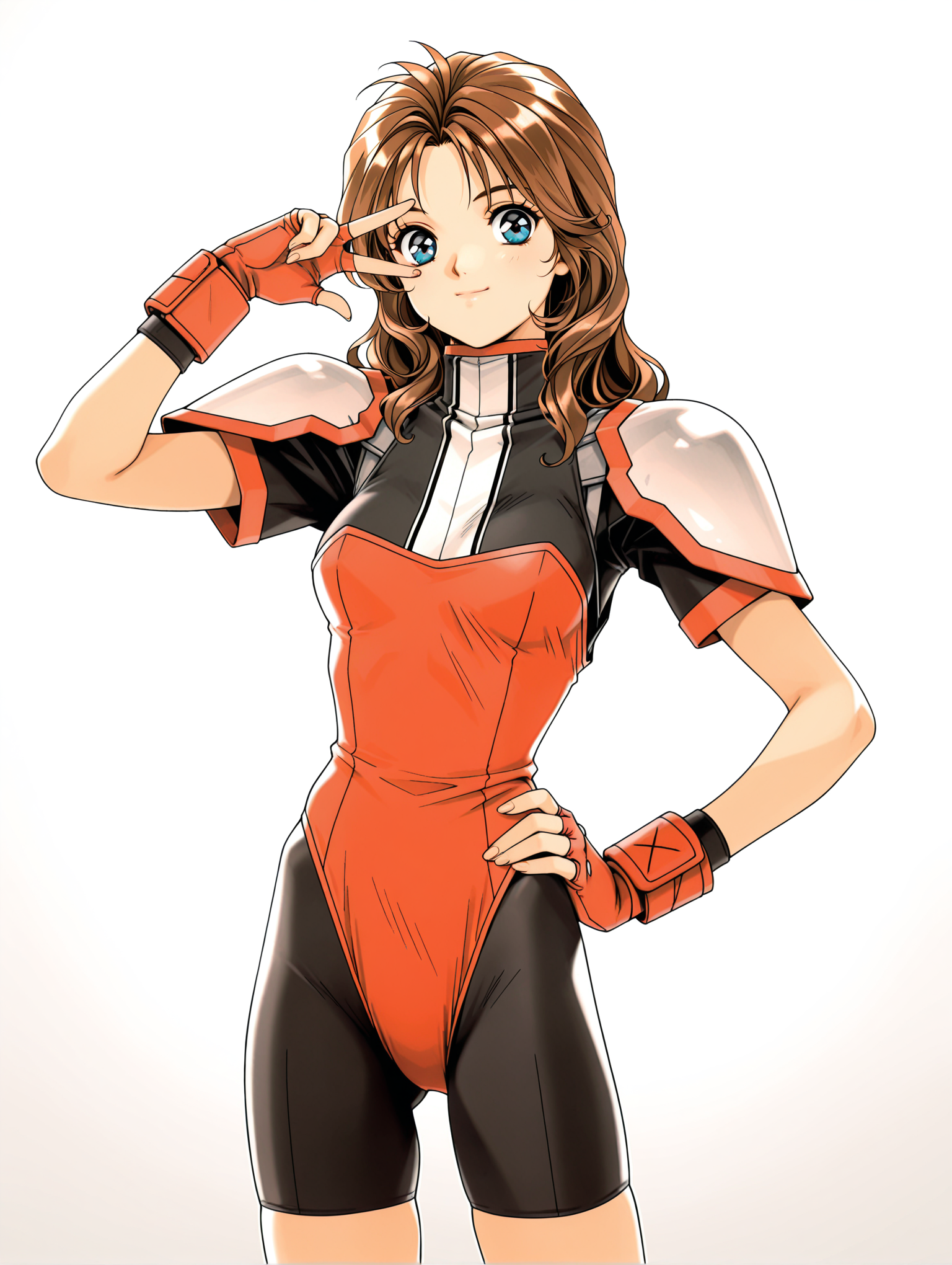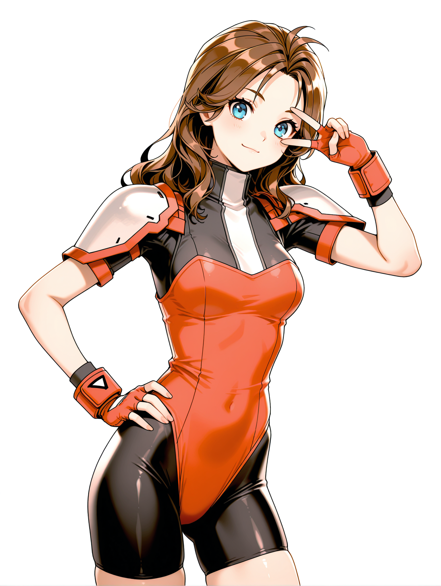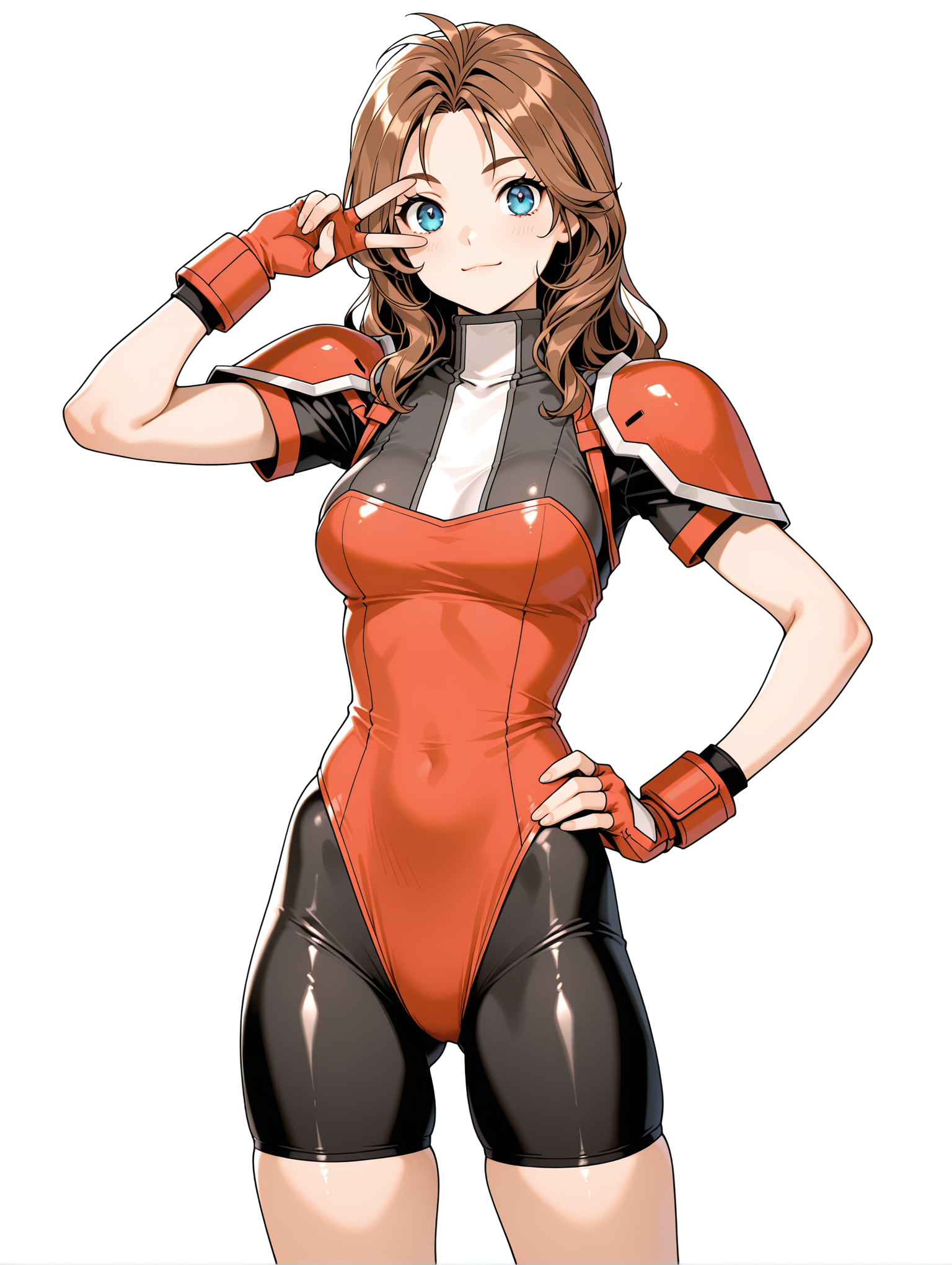 복장(파일럿 슈트) ・h_suit,turtleneck,pauldrons,bodysuit,short sleeves,red fingerless gloves,red leotard,spandex,bike shorts,ankle boots,high heels,