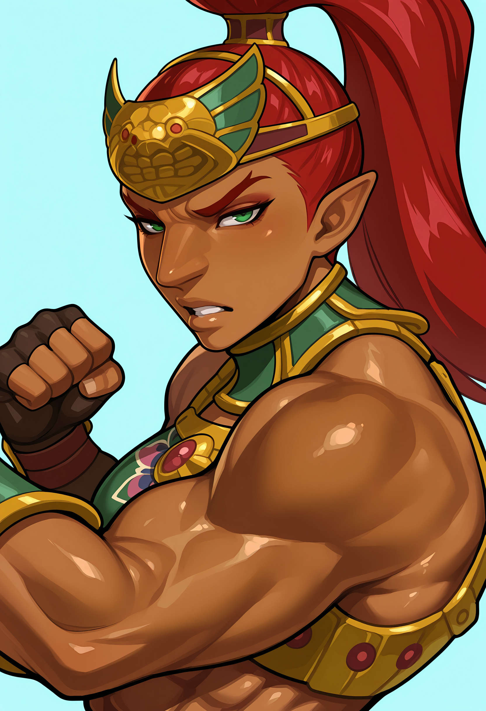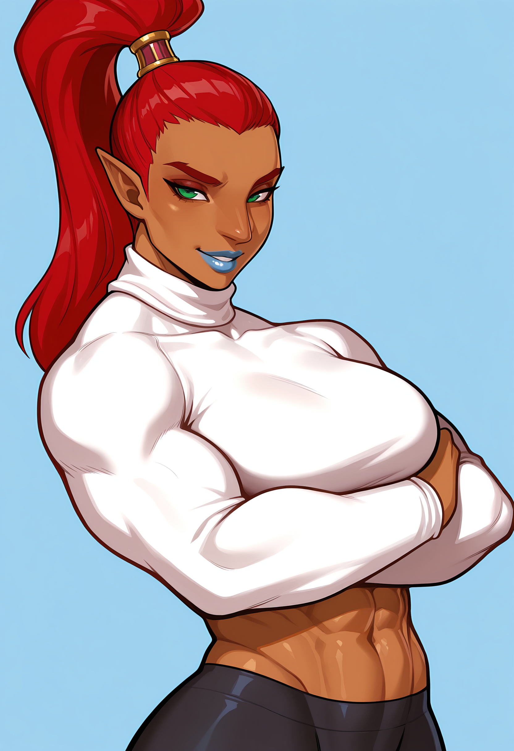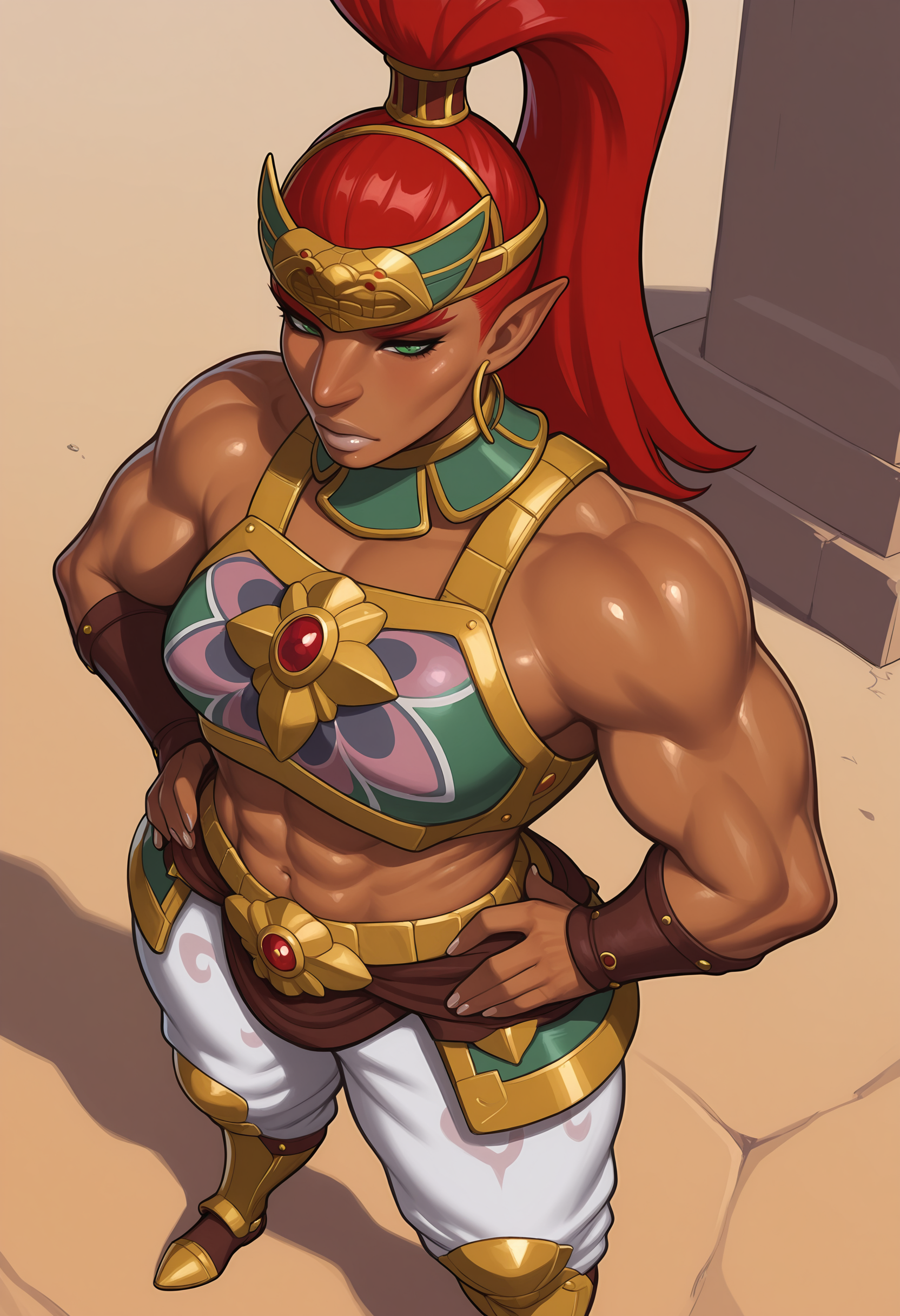 bulrilf, 검은 피부의 여성, 높은 포니테일, 뾰족한 귀, 붉은 머리, 녹색 눈, 이마 보호대, 갑옷, 바지