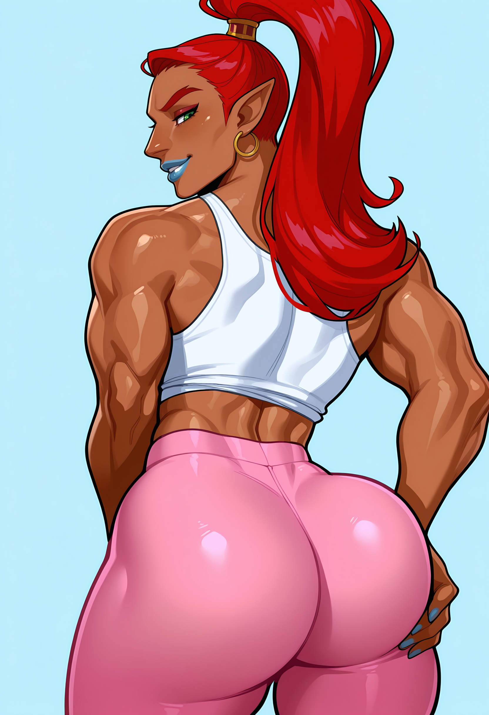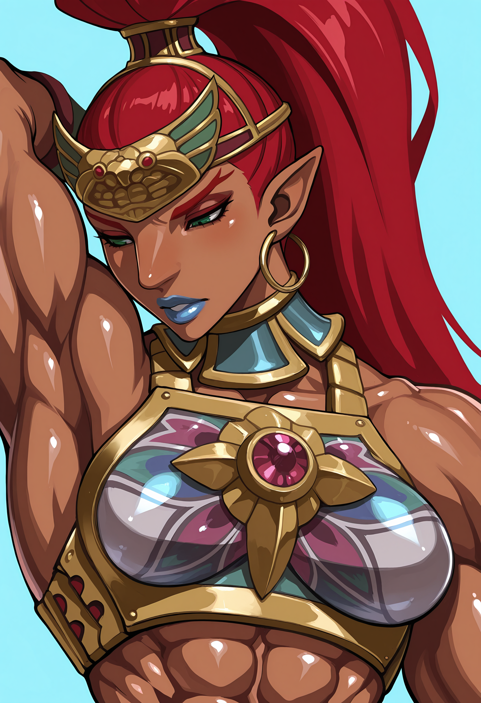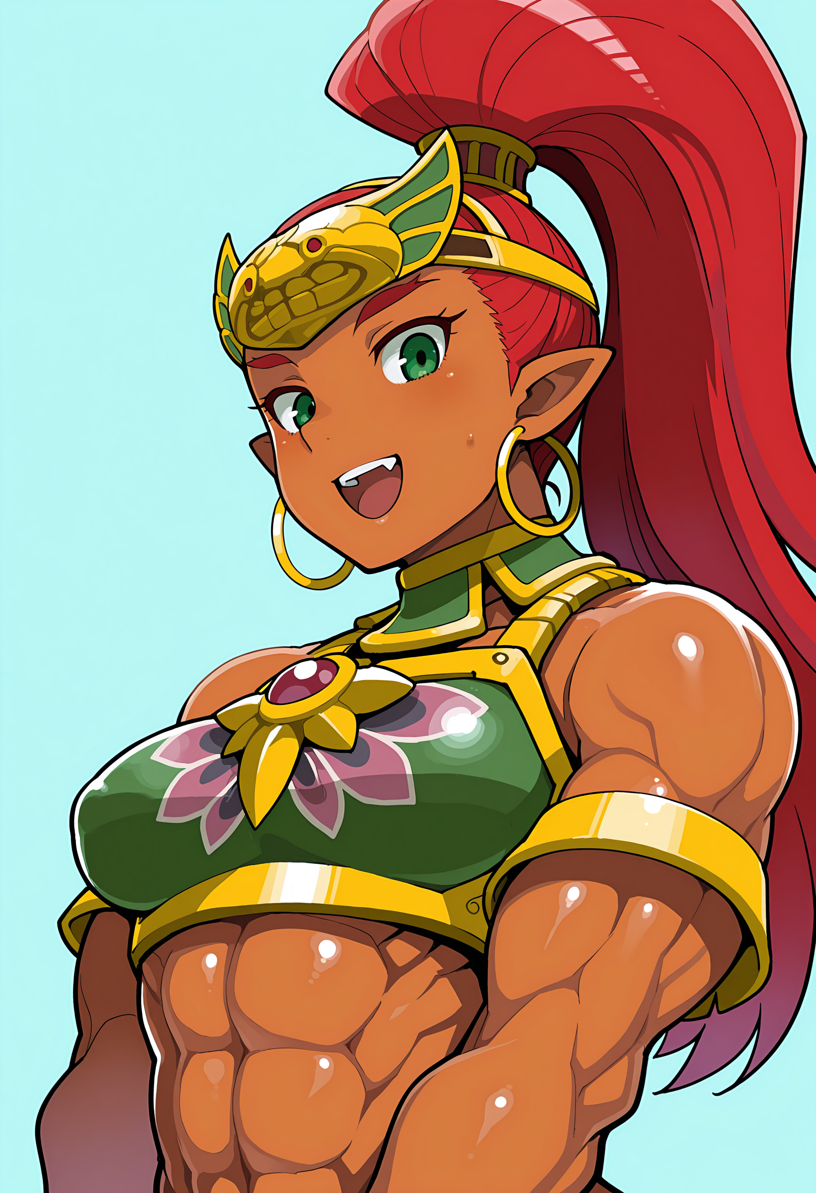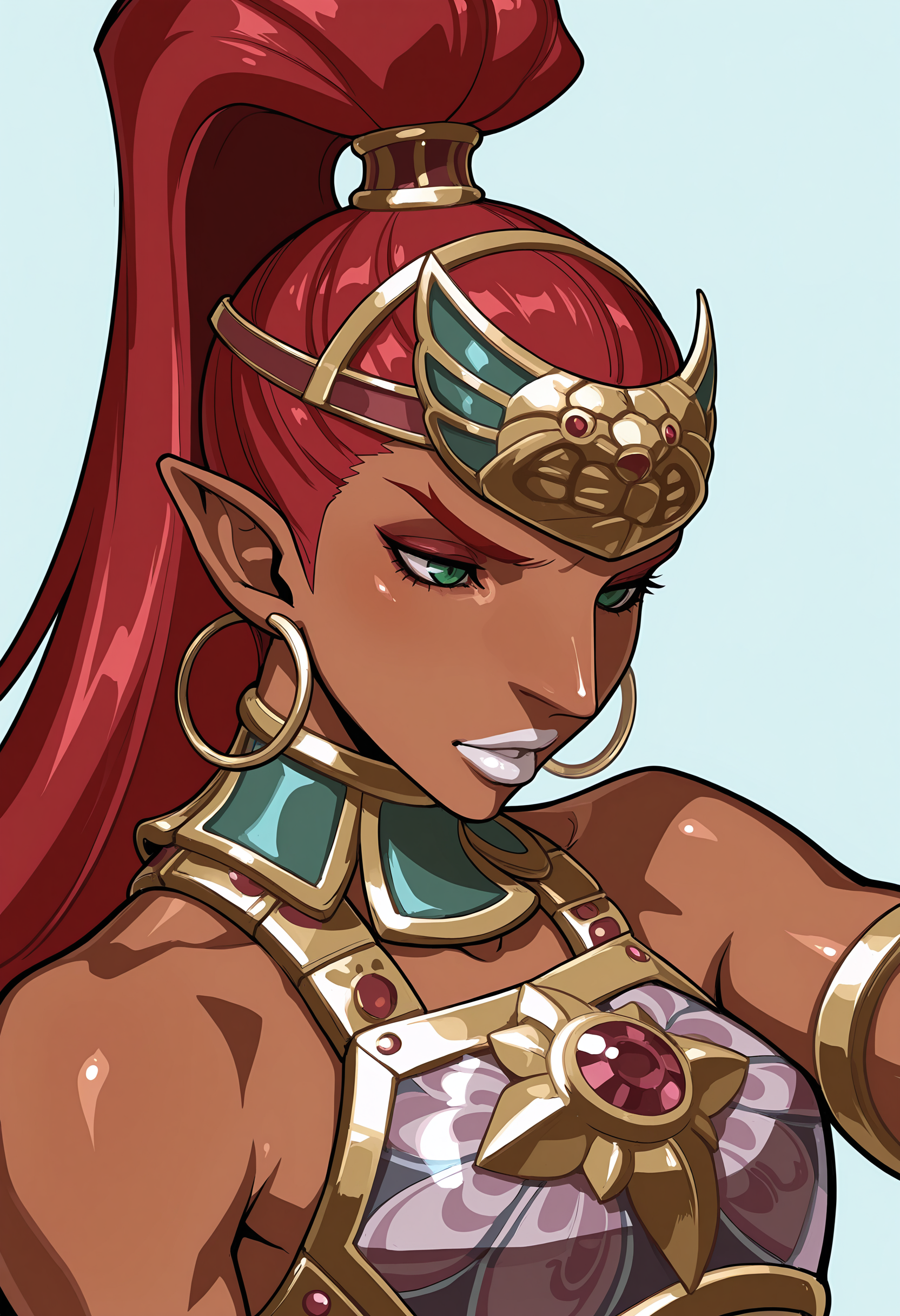 bulrilf, 검은 피부의 여성, 높은 포니테일, 뾰족한 귀, 붉은 머리, 녹색 눈, 이마 보호대, 갑옷, 바지