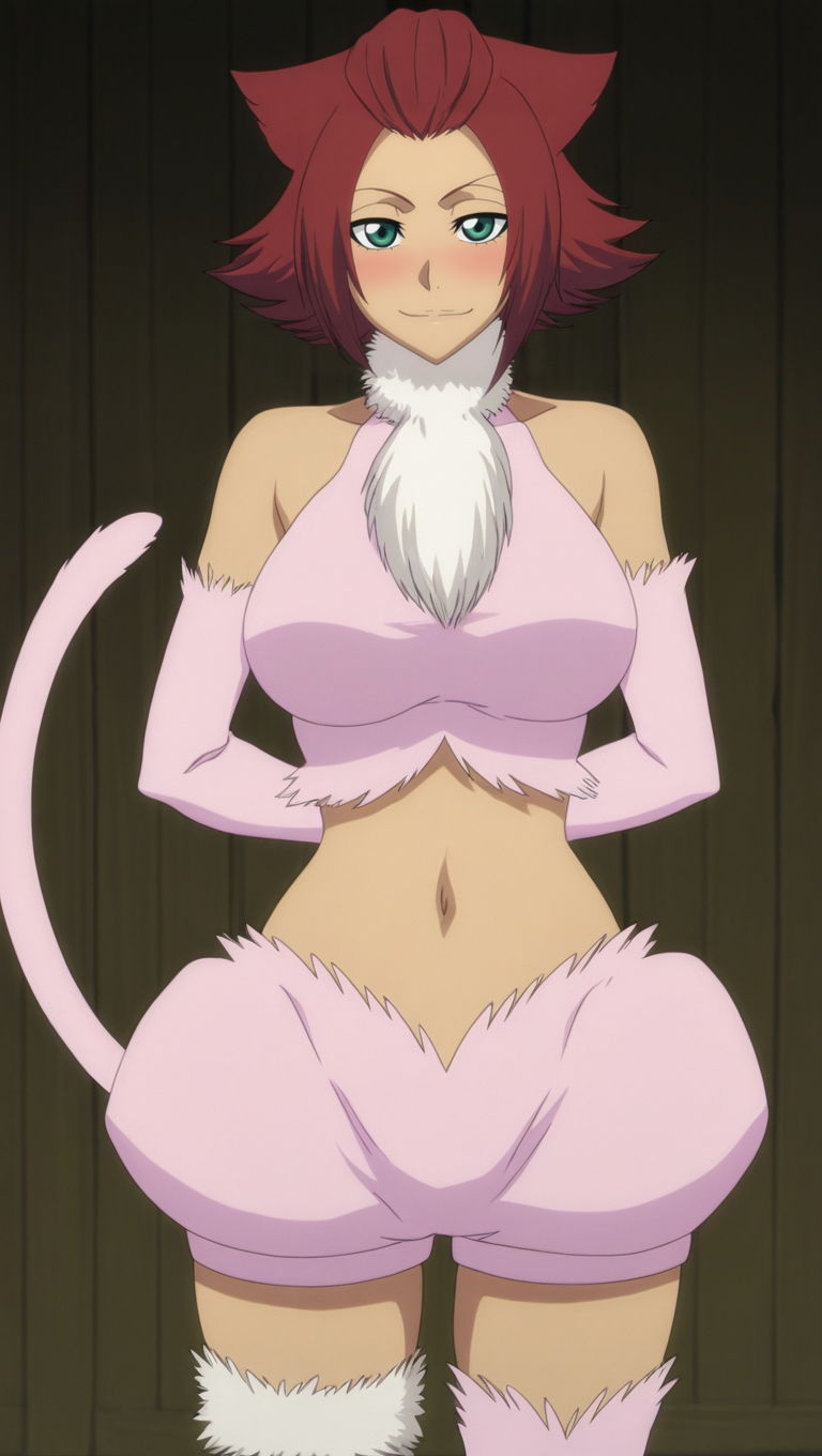 sp1r1t 복장, 분홍색 털 크롭 탑, 흰색 털 칼라, 분리된 털 소매, 분홍색 퍼프 스커트, 털 허벅지 스트랩, 단일 분홍색 허벅지 양말, 분홍색 발목 부츠, 분홍색 고양이 꼬리, og 스타일, 큰 가슴, 배꼽,
