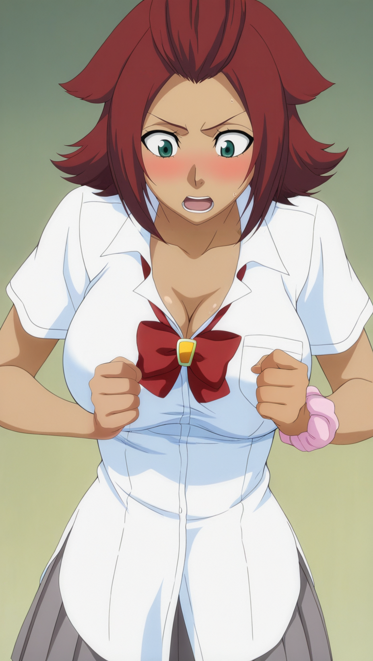sch001 un1, 흰색 셔츠, 빨간 리본, 회색 주름 치마, 흰색 허벅지 양말, 분홍색 웨딩 가터, 단일 분홍색 손목 스쿼치, og 스타일, 큰 가슴,