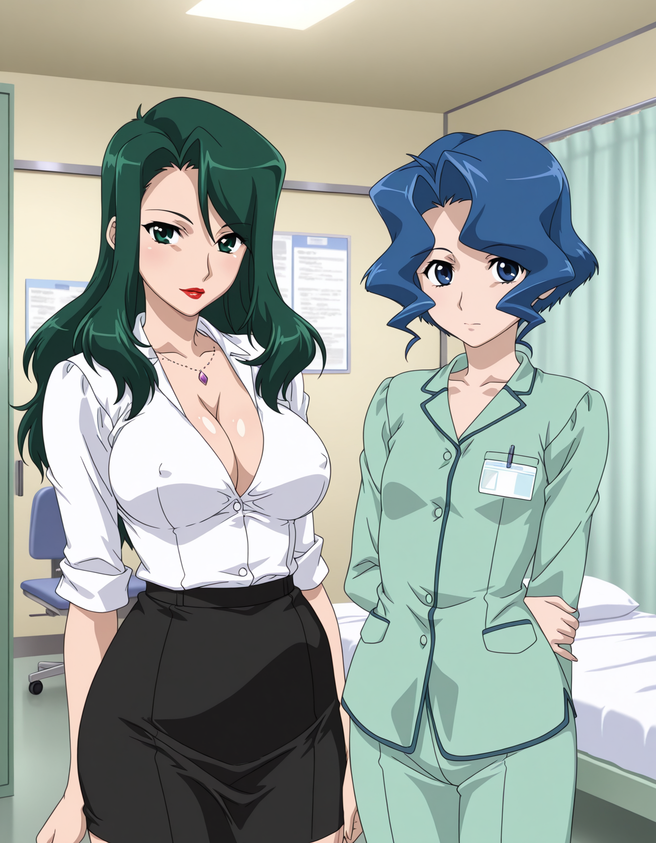 mai_owm,mai_saekoom,mature_female,long_hair,green_hair,green_eyes,large_breasts,red_lips,cleavage,necklace,office_lady,white_shirt,open_shirt,covered_nipples,lingerie,black_pencil_skirt,red_high_heels