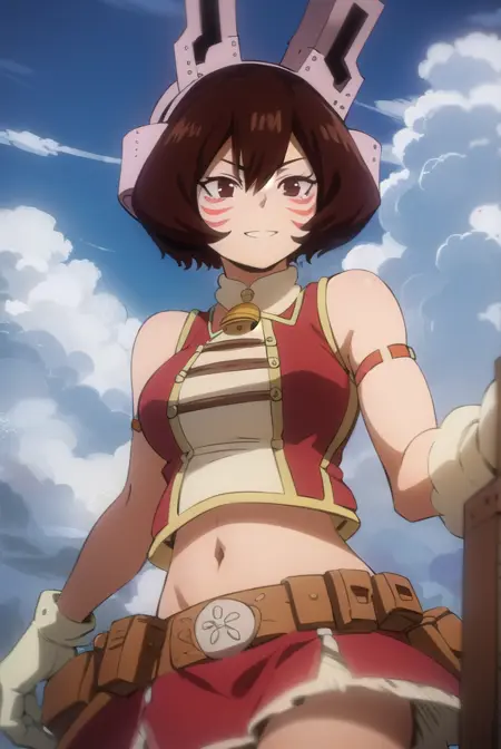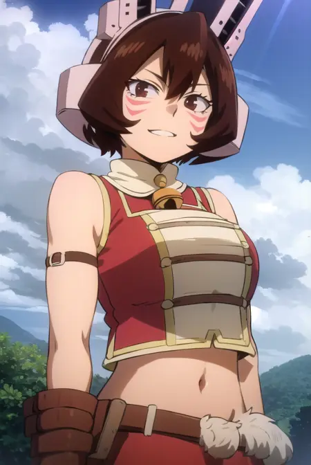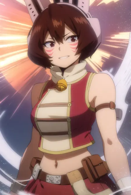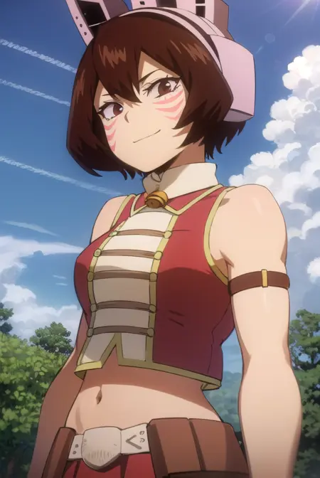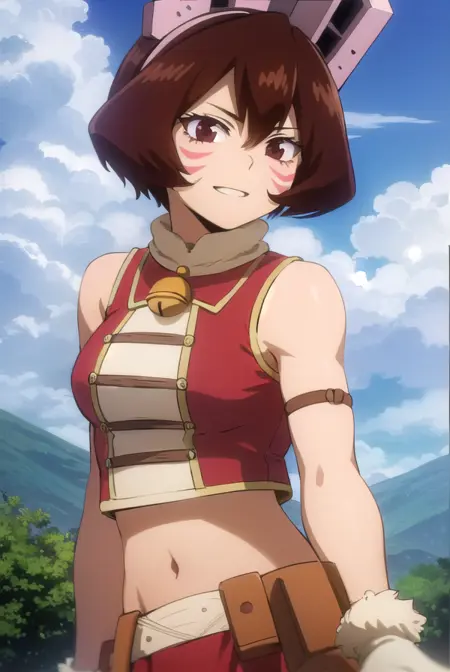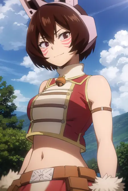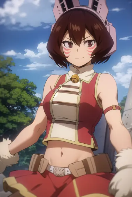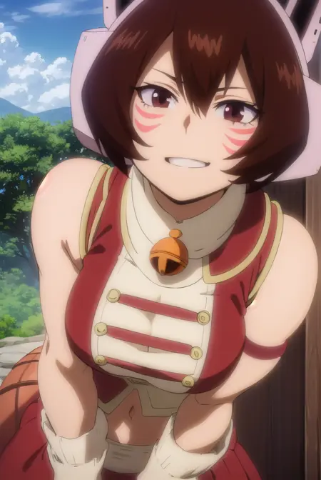 headgear, facial mark, facepaint, animal ears, gloves, navel, sleeveless, midriff, bell, red skirt, neck bell, animal hands, paw gloves,