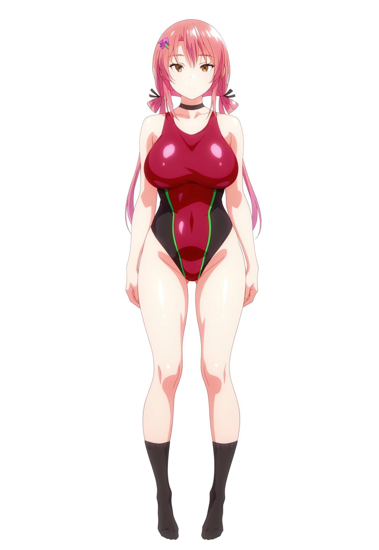 Takamine Ayame, pink hair, long hair, low twintails, brown eyes, large breasts, black choker, black hair ribbon, hair ornament, red one-piece swimsuit, multicolored swimsuit, black socks