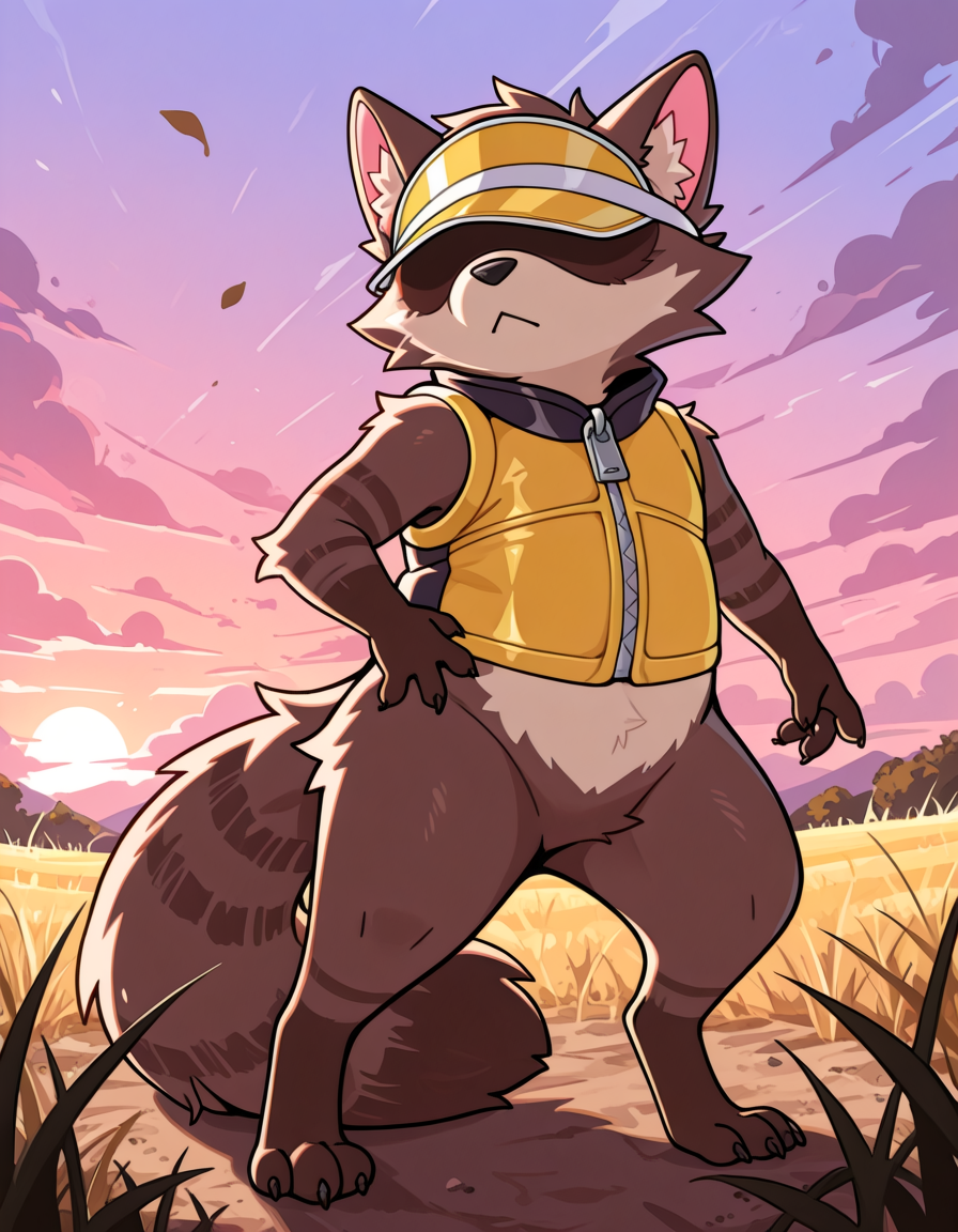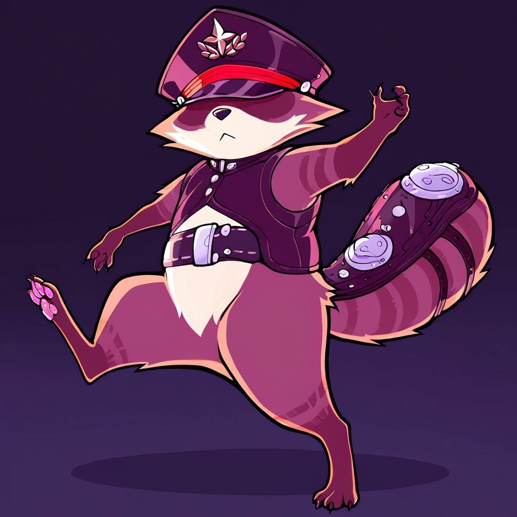 | 训练词汇 | tanuki, brown fur, tan underbelly, tan snout, animal nose, black nose, triangular nose, :<, hidden eyes, hidden ears, multicolored fur, stripes on arms, dark-brown forearms, very dark-brown fingers, stripe on legs, dark-brown legs, very dark-brown toes, pink pawpads, mask \(marking\), dark-brown mask \(marking\), bushy tail, fluffy tail, striped tail已复制! black peaked cap, golden four-pointed star and laurel crown emblem on cap, red band on cap, white screws on cap, black vest with three white buttons, black belt with white buckle, black pad with white screws on tail, black straps on tail已复制! animal ears, tan inner ear, pink inner ear fluff,已复制! yellow visor cap, white band on cap, yellow and black vest with zipper已复制! |