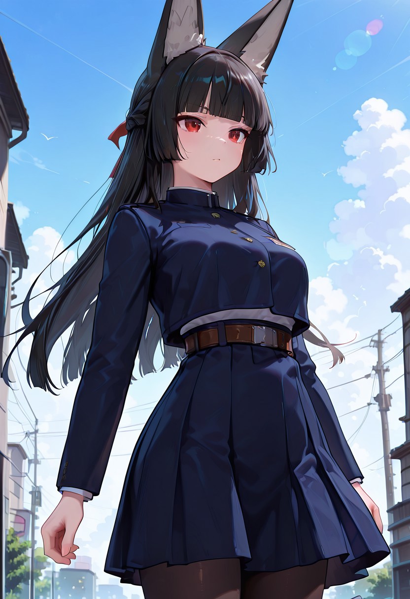 nbrkgskclstyl,uniform, dark blue cropped jacket, long sleeves, white shirt, high-waist skirt, pleated skirt, dark blue skirt, brown belt, black pantyhose