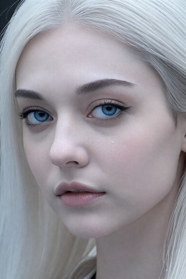 slavic_ice_v1, (intense hypnotic ice-blue eyes:1.3), (bright white hair:1.3), (platinum blonde:1.2), cold porcelain skin, (pale alabaster skin tone:1.2), refined V-shaped jawline, high-fashion makeup, sharp chiseled features, (glistening skin texture:1.1),