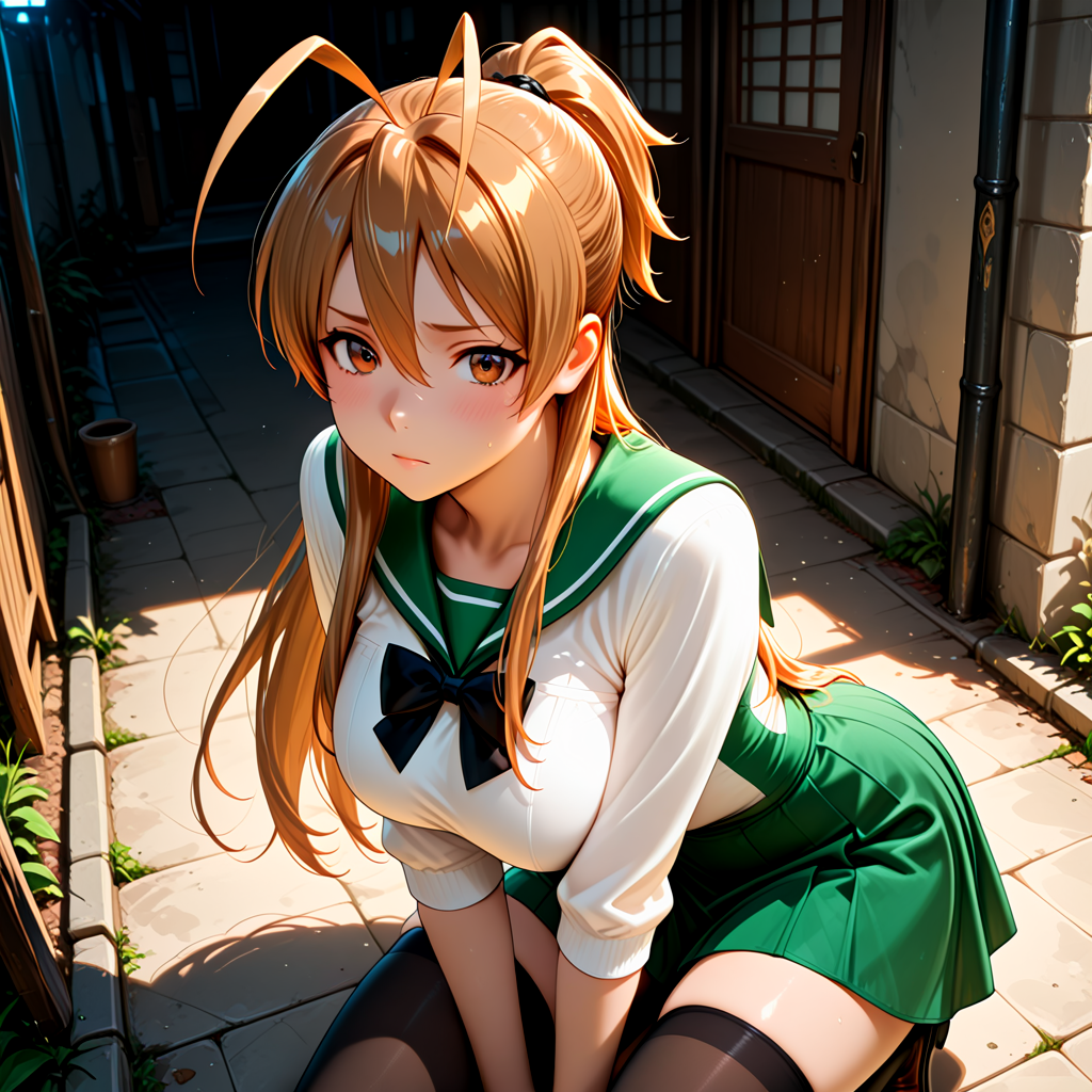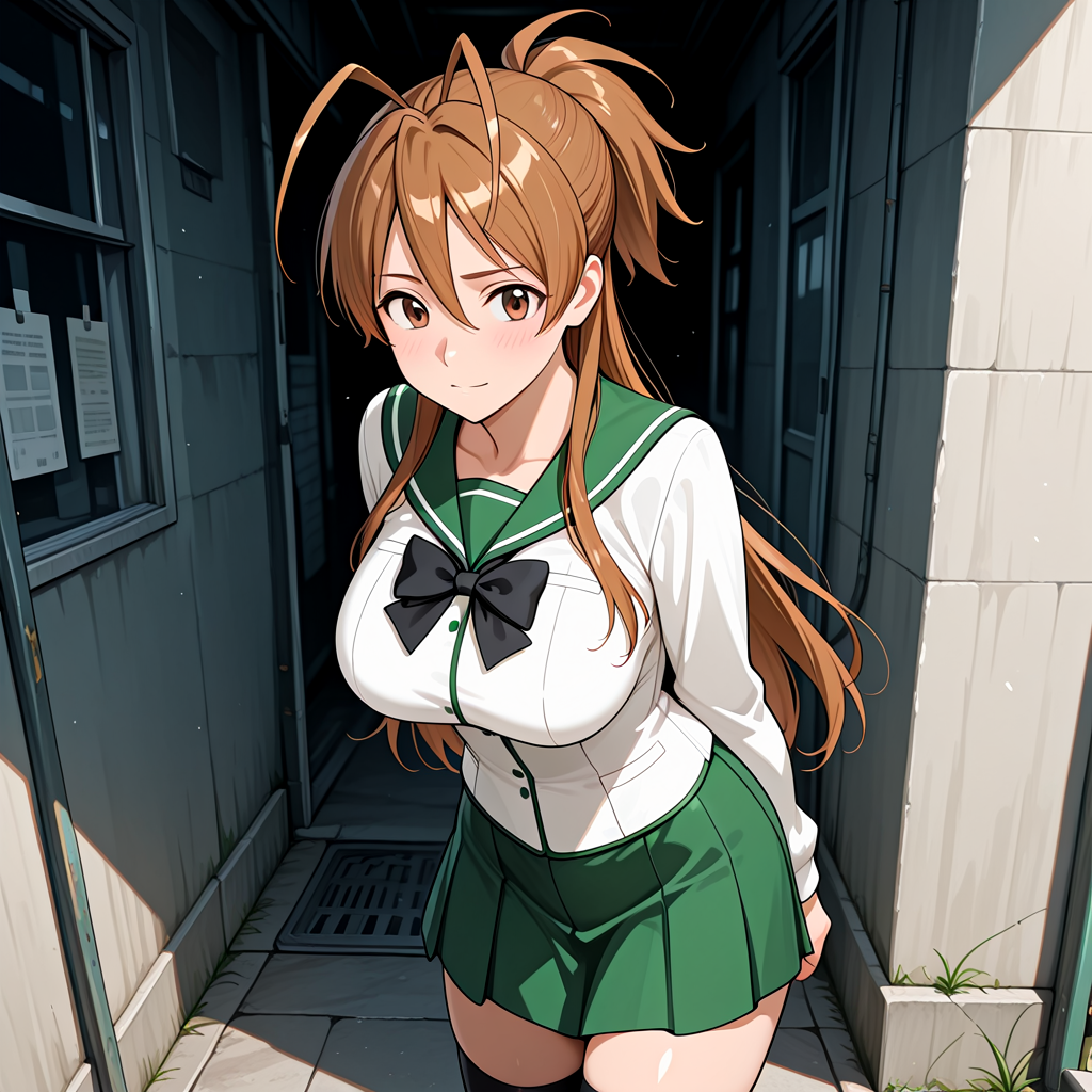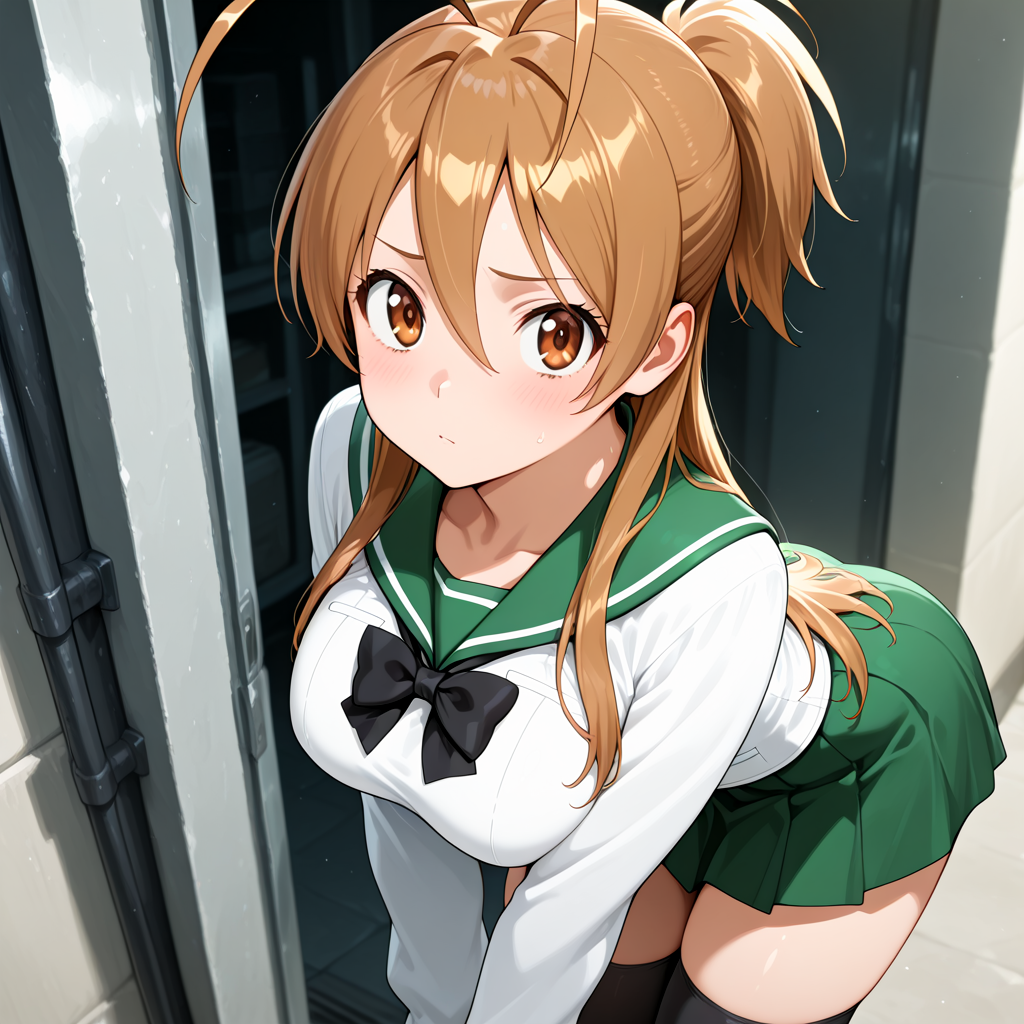 reih, brown hair, long hair, antenna hair, ponytail, brown eyes, white top, green skirt, thighhighs,