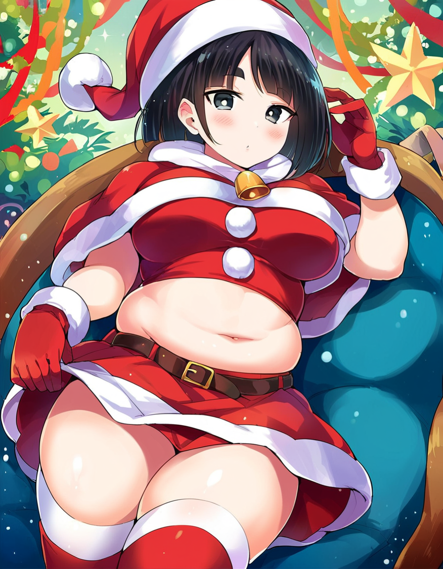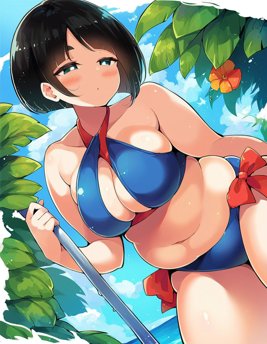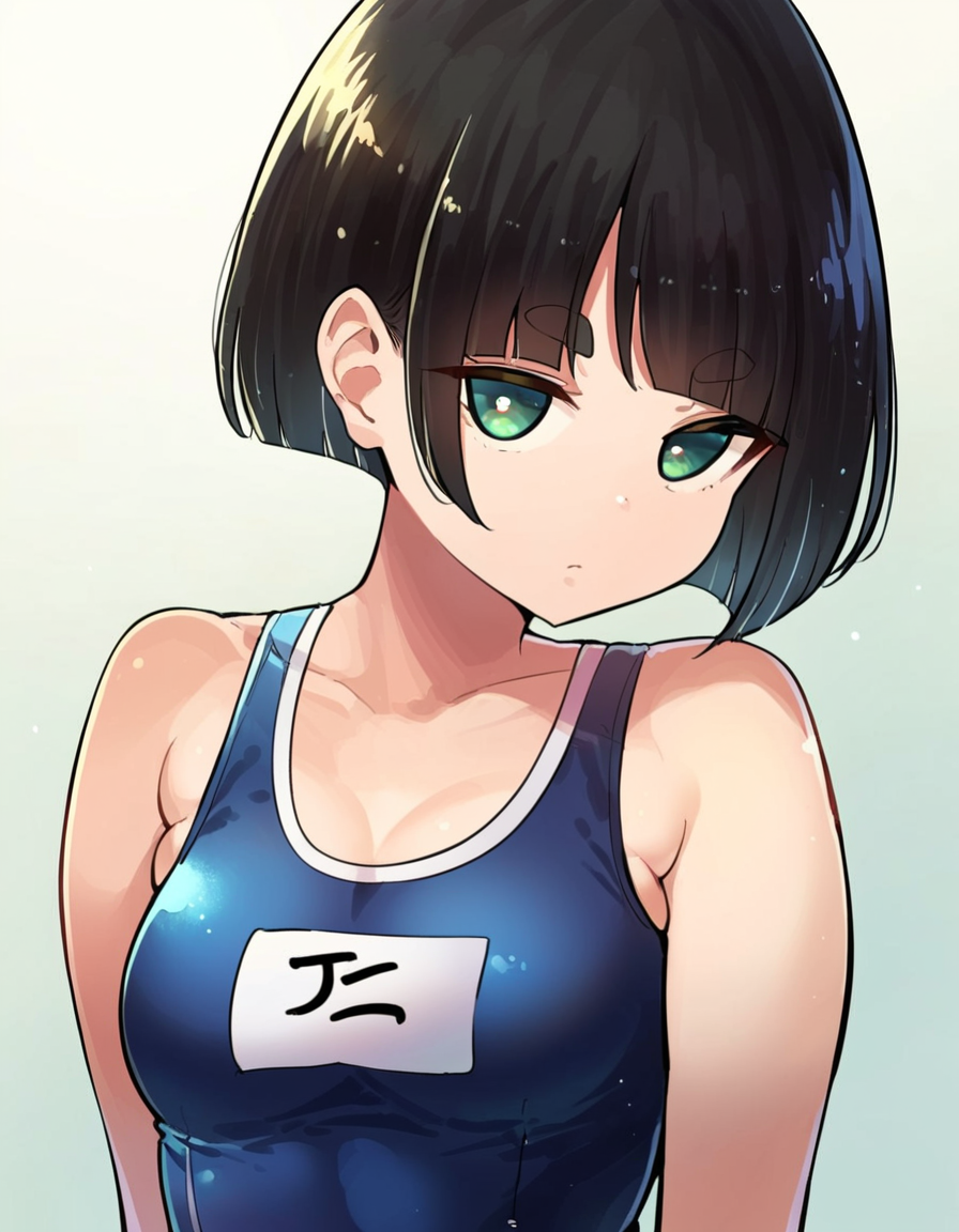 説明としては、1girl, green eyes, black hair, short hair, bangs, thick eyebrows, bob cut, blunt bangs, plump, breasts, large breasts とします。