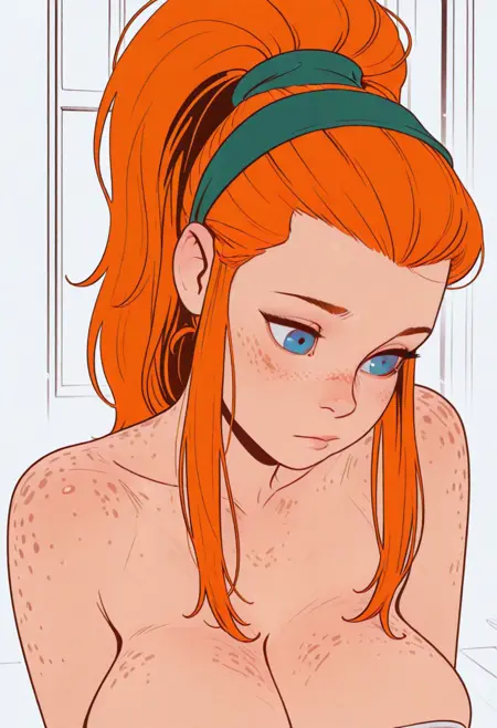 1female, orange hair, long hair, huge breasts, body freckles, blue eyes, ponytail,hair pulled back, green hairband, sidelocks,