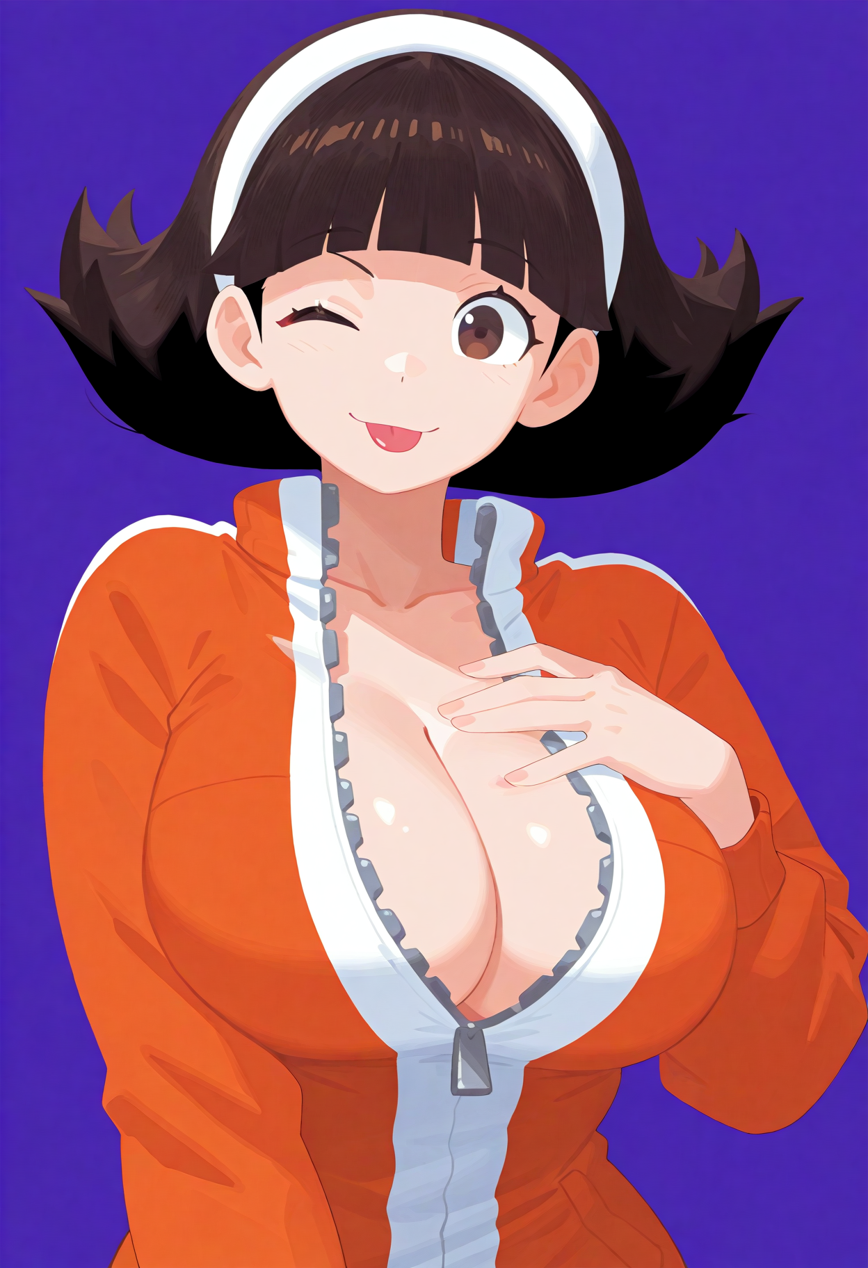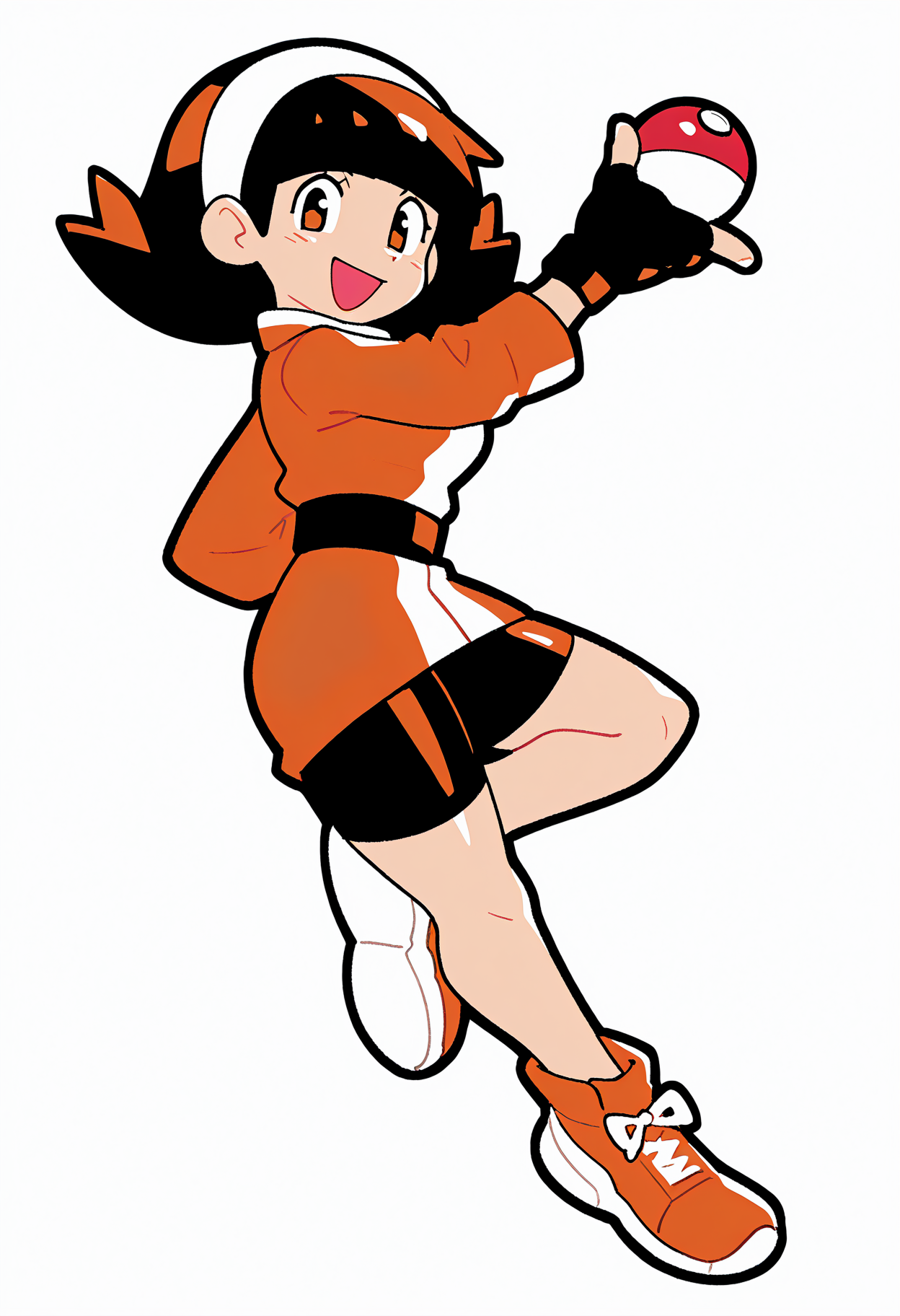 키워드는 acetrainergsc이며, 기본 옷차림으로는: 갈색 머리카락, 갈색 눈, 단발, 흰색 머리띠, 주황색 코트, 자전거 반바지, 주황색 신발, 검은 장갑, 손가락 없는 장갑, 뒤집힌 머리카락