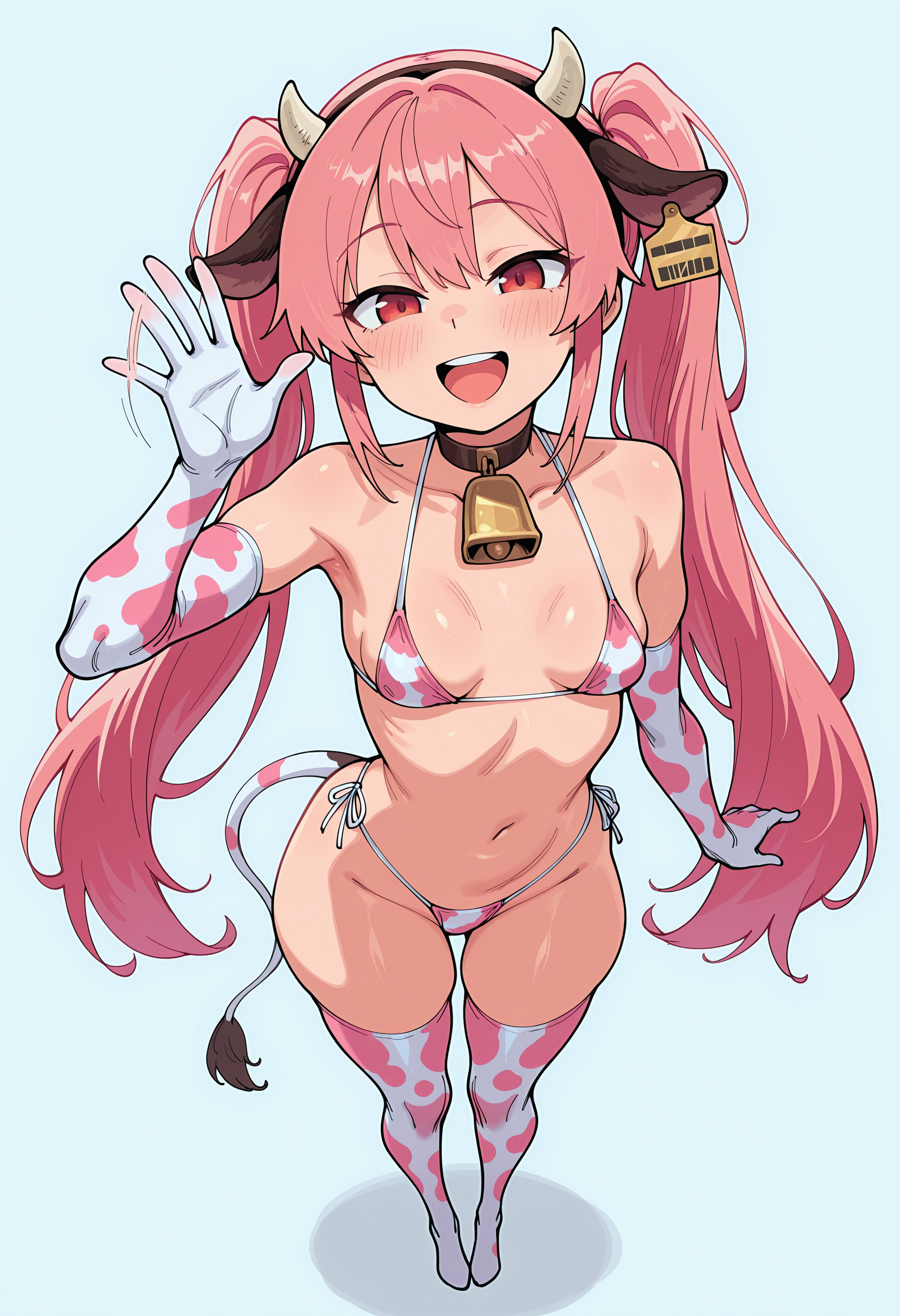 衣装:牛模様、鈴、ビキニ、太ももハイ、肘まで手袋