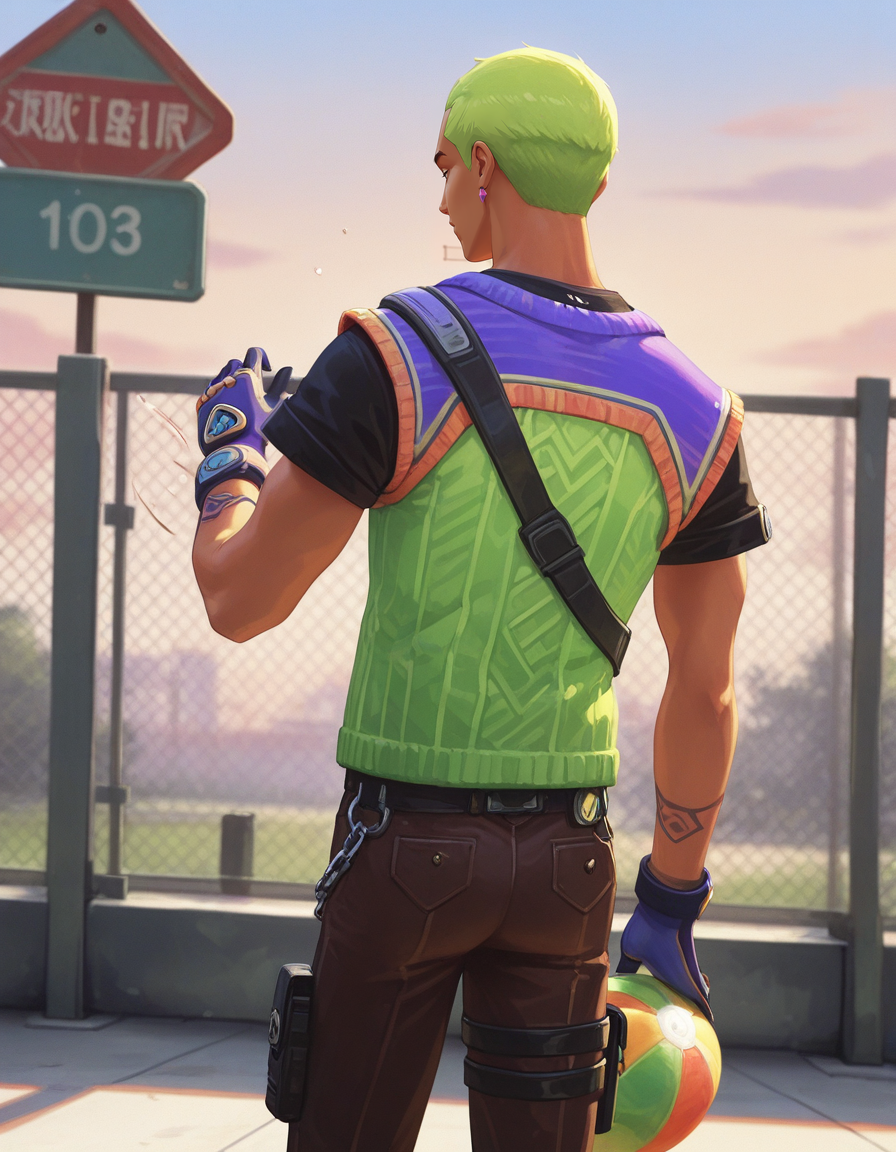 1boy,mai_gekkov,dark-skinned_male,very_short_hair,blonde_hair,brown_eyes,mole,earrings,arm_tattoo,shirt,short_sleeves,green_vest,brown_pants,plaid,fingerless_gloves,black_gloves,blue_socks,white_sneakers,backpack,holding_handgun,animal_on_shoulder