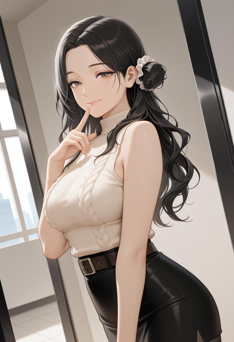 - Single Side Bun:"brown eyes,black hair,long hair,single side bun,parted hair,hair scrunchie,two moles,mole under left eye"